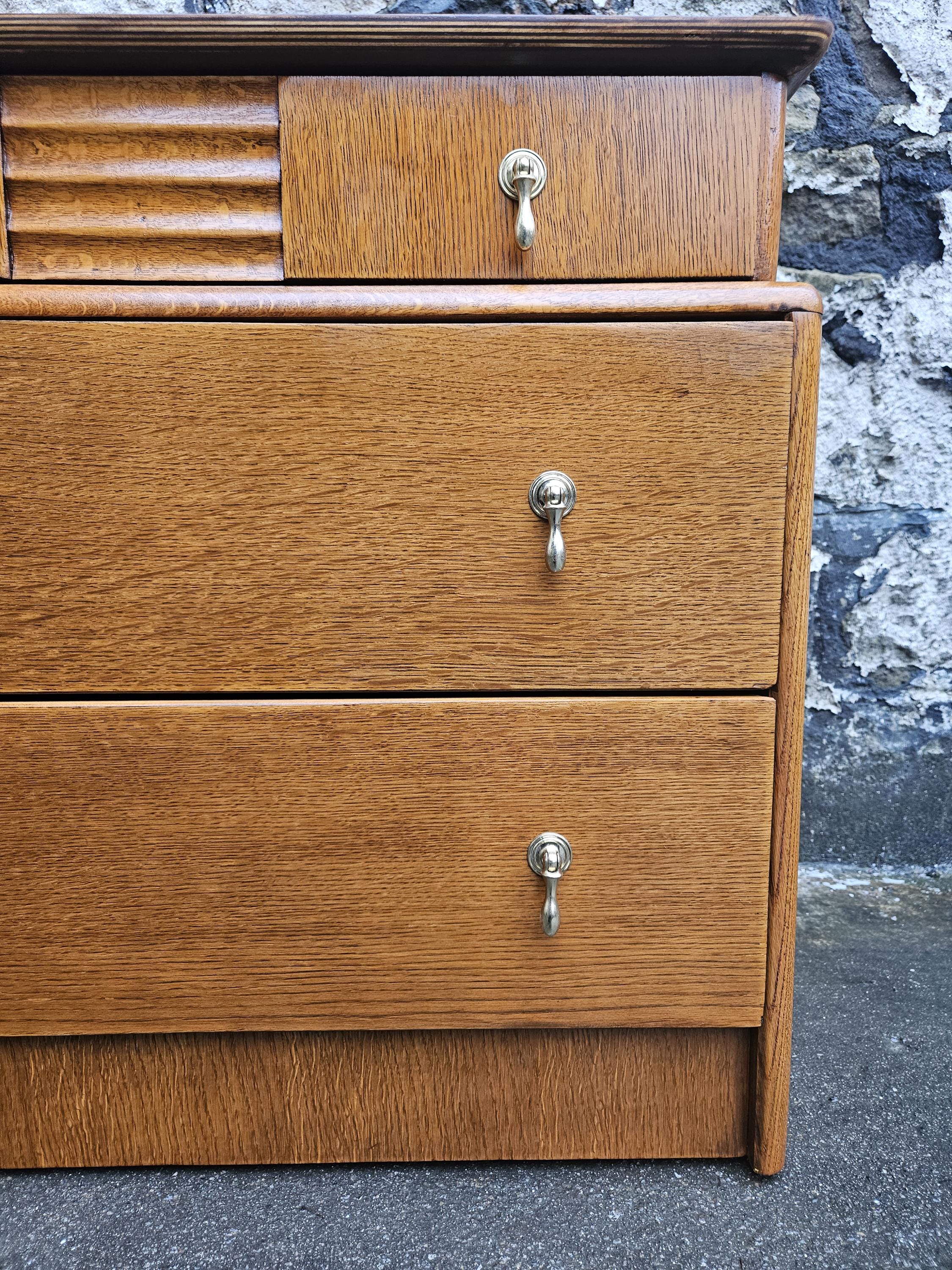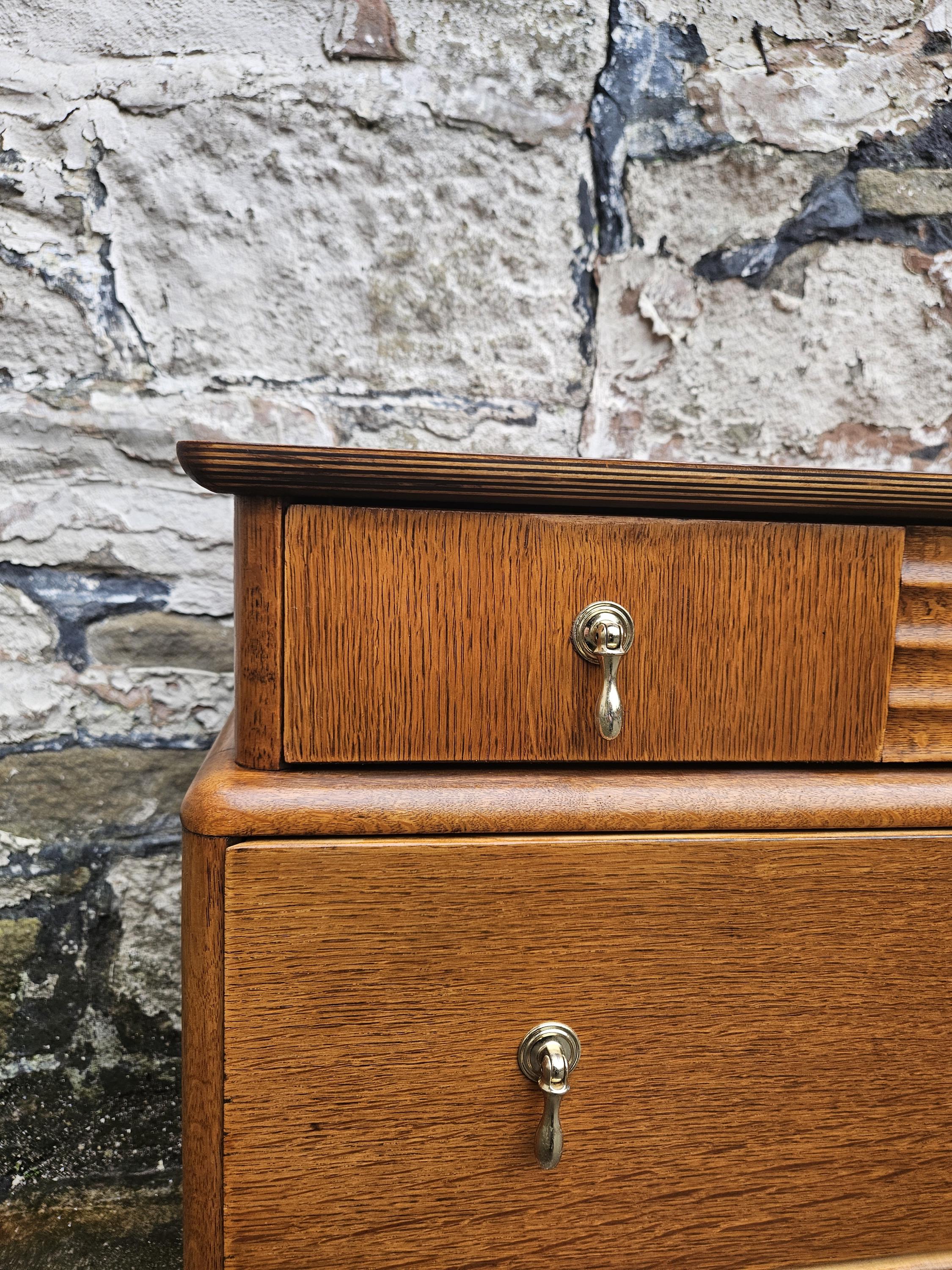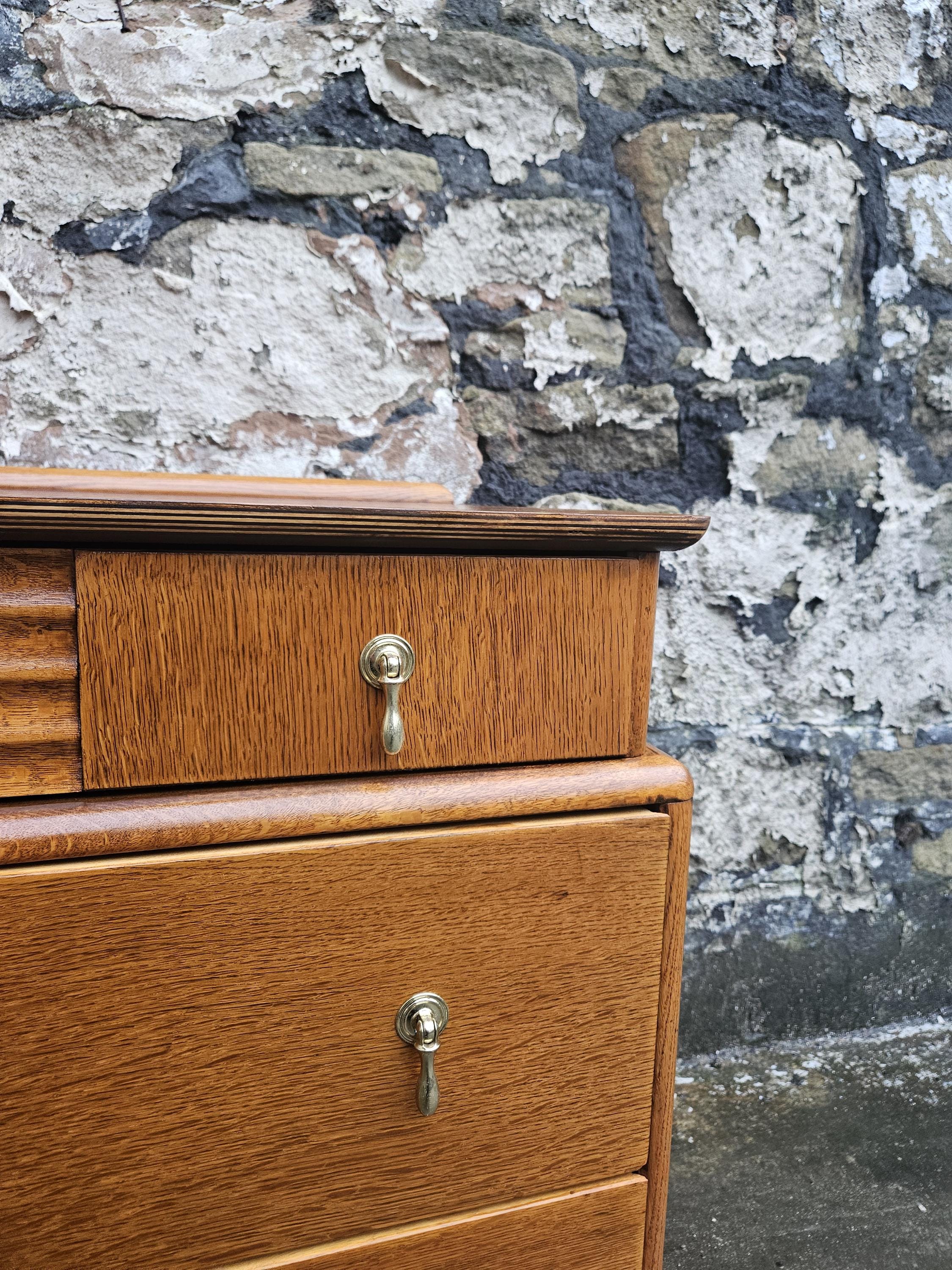 A stunning piece of vintage and mid century furniture in a three drawer oak chest by Stag furniture. The cabinet consists of three hand crafted drawers with each drawer having superb dove tail jointing and offering excellent storage, on each drawer front their are two brass drop pendant handles with back plates and with each one super ornate. The cabinet has beautiful carved detailing within the centre of the top drawer, with the bottom two drawers stepped out and with curved sides a small back riser running along the top while to the base the chest sit's on a plinth base. The chest has been crafted by Stag furniture and has the Stag makers label within the centre drawer. The cabinet is a superb piece of vintage and antique furniture with a wonderful look and design and with great proportions and a lovely oak colour that would suit any home or environment.