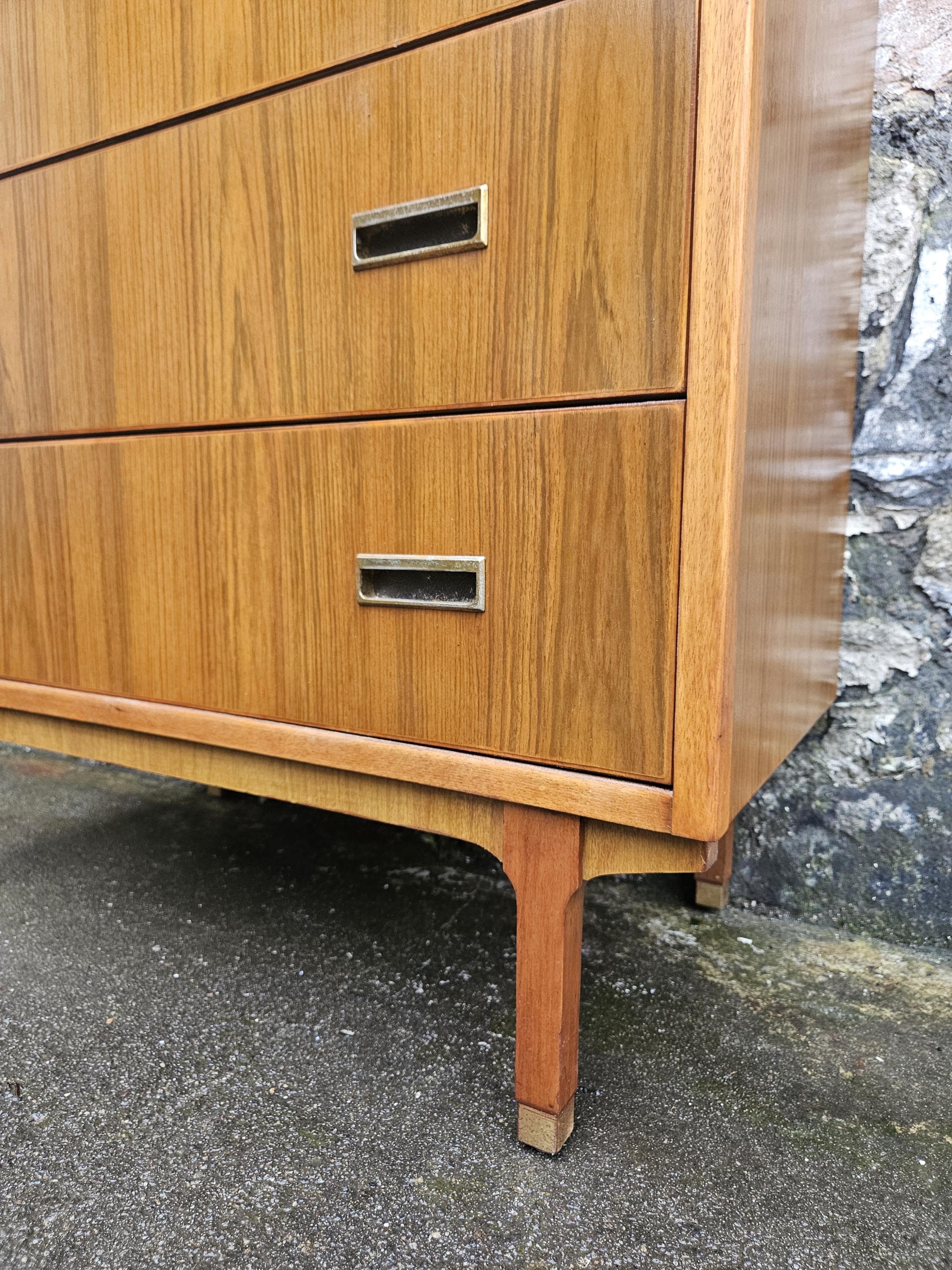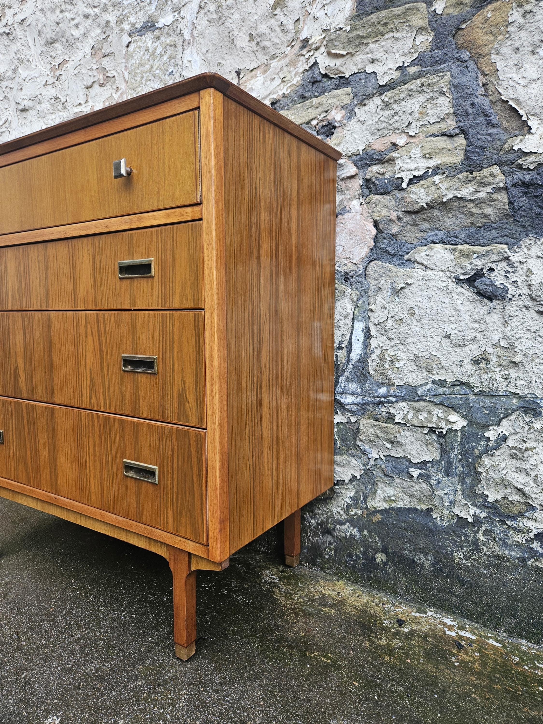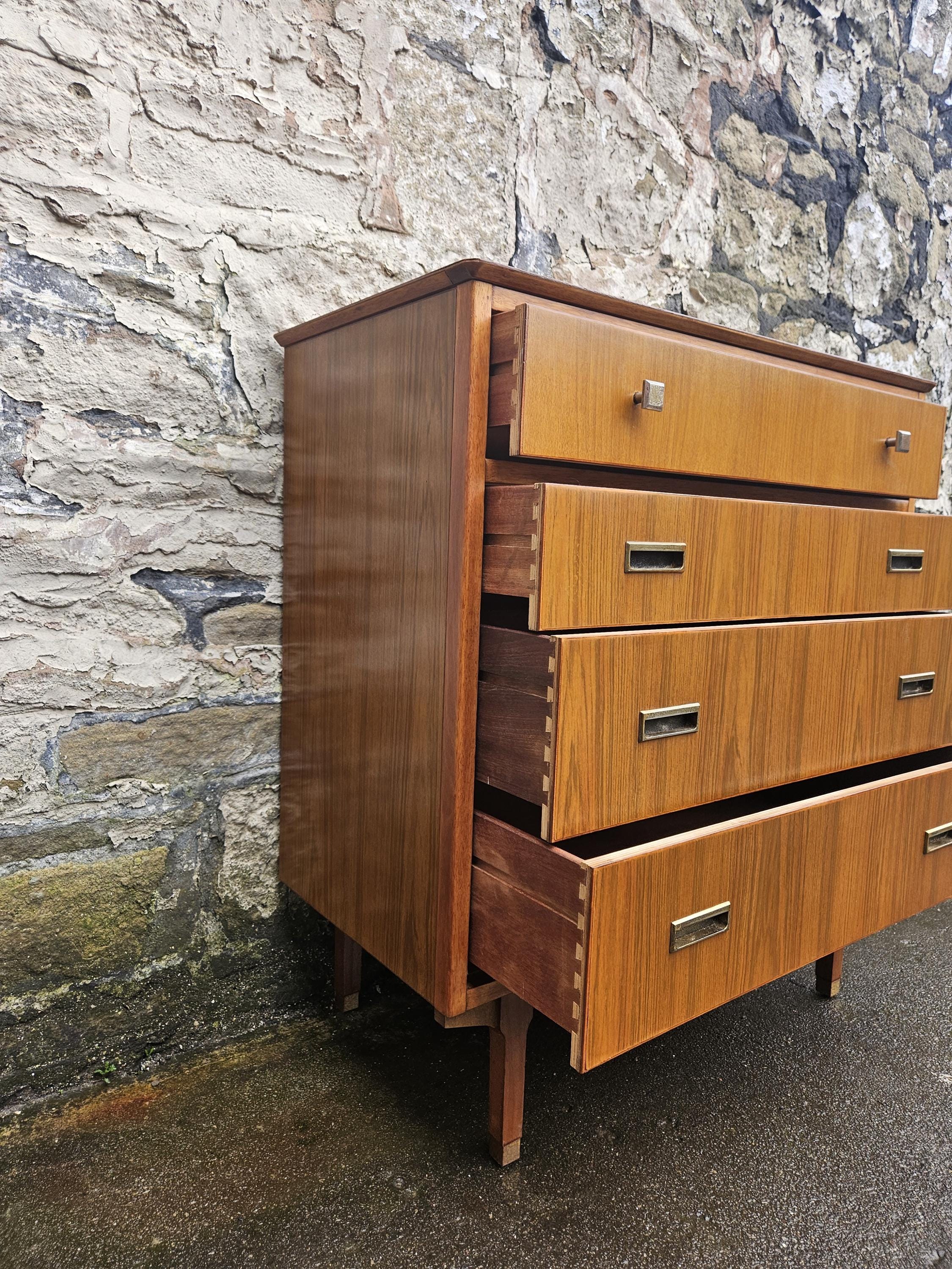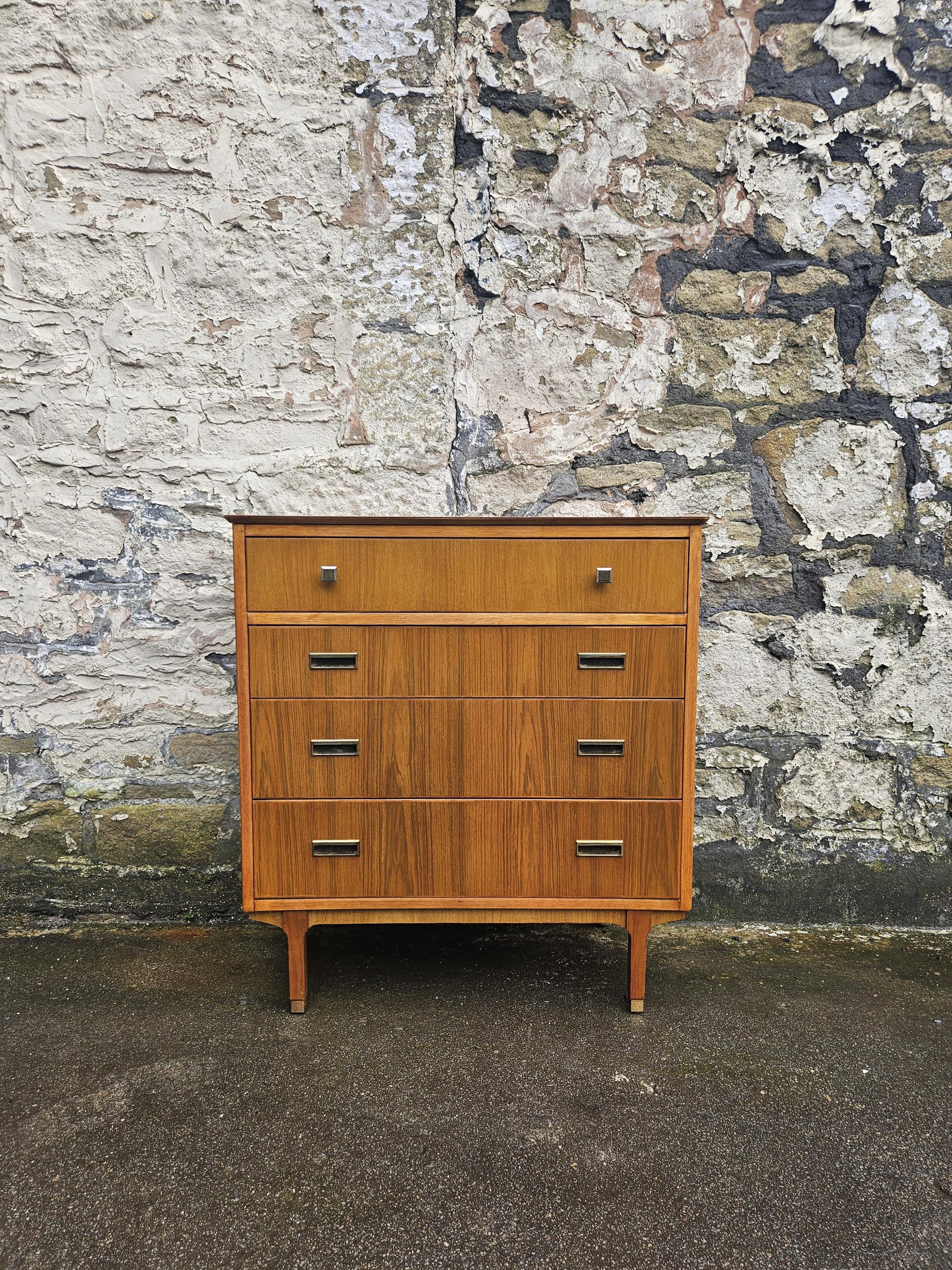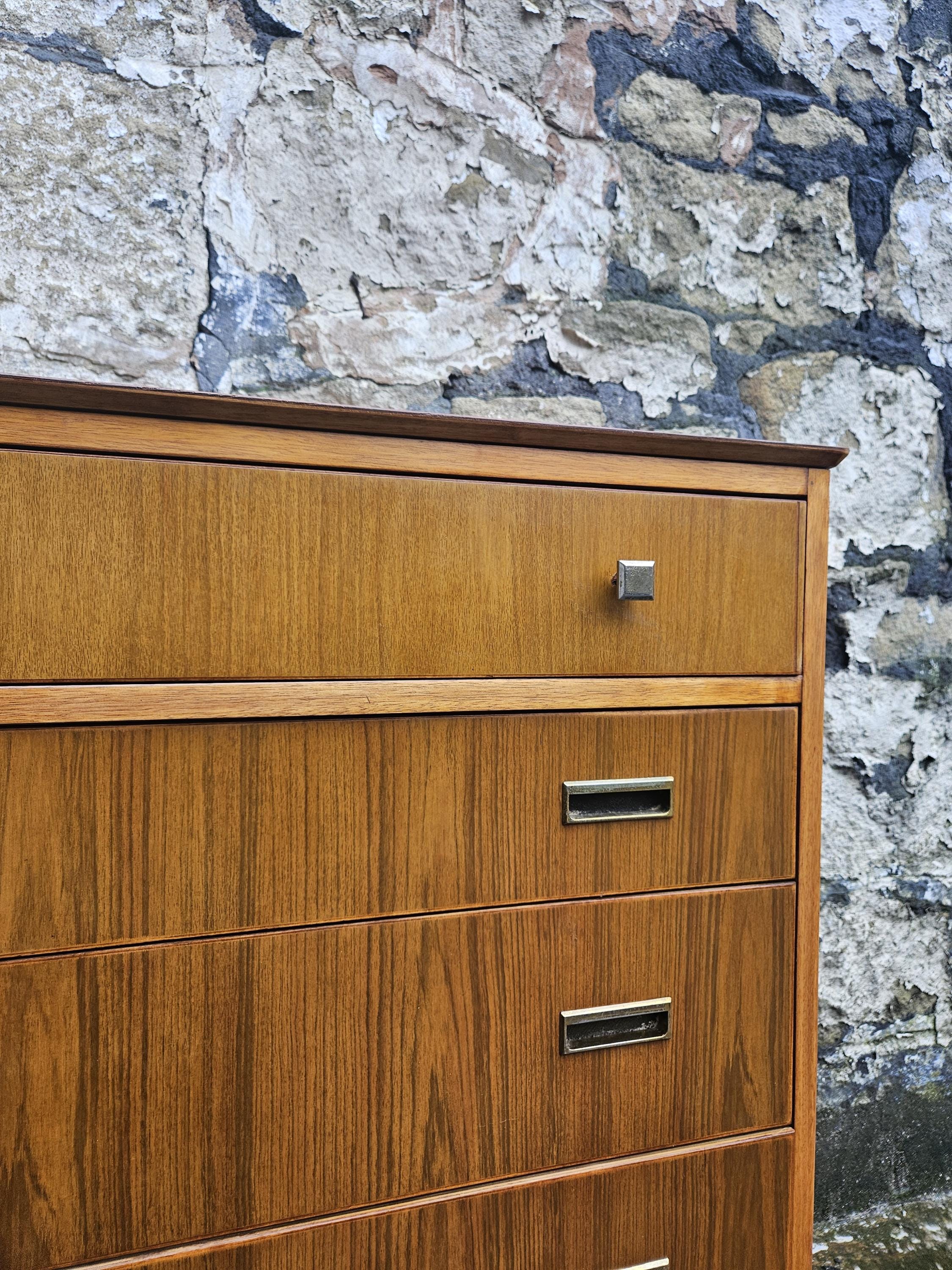 Mid Century Teak Chest of Drawers: Vintage Tallboy Cabinet Four Drawer With Brass Detailing