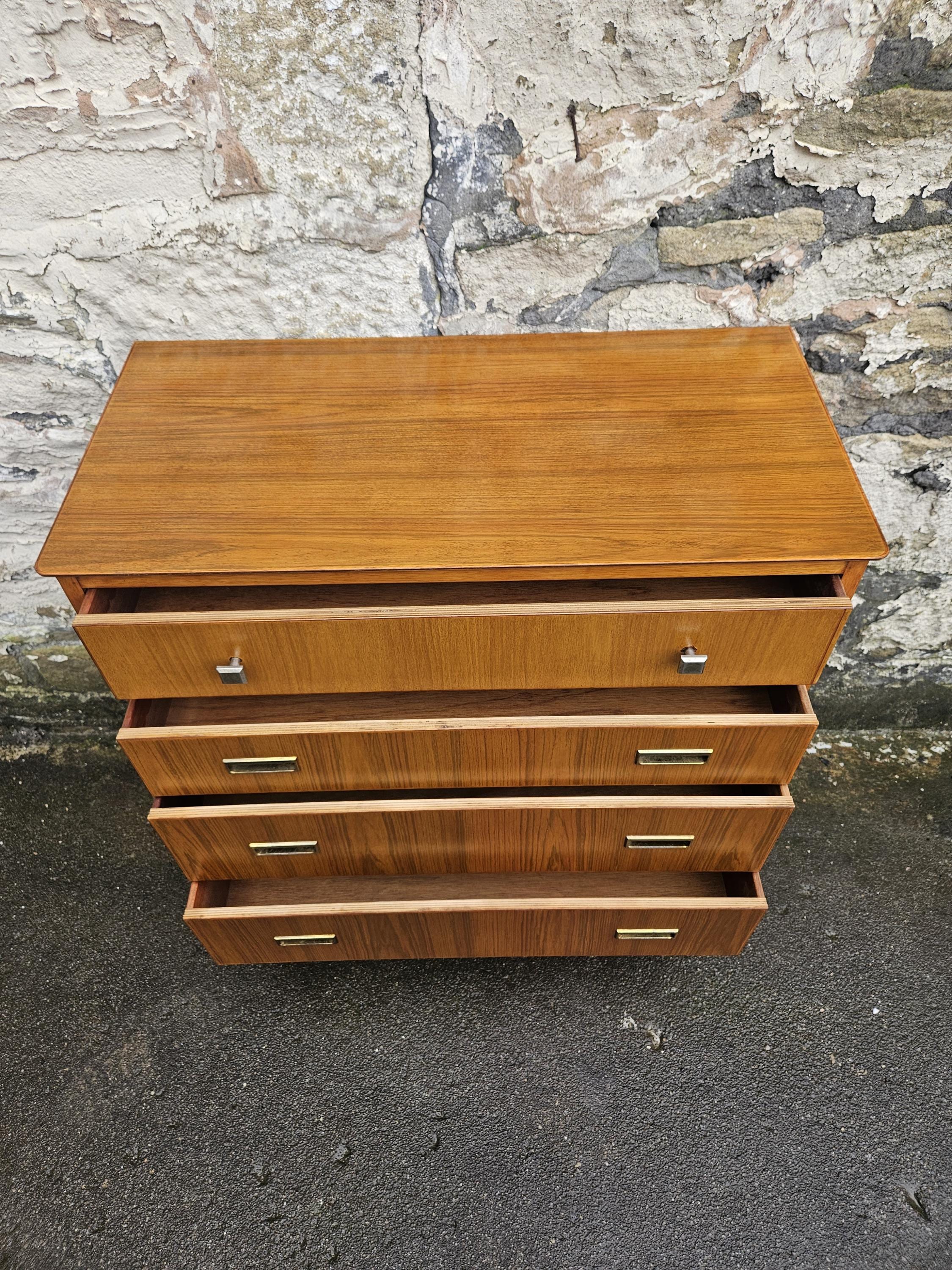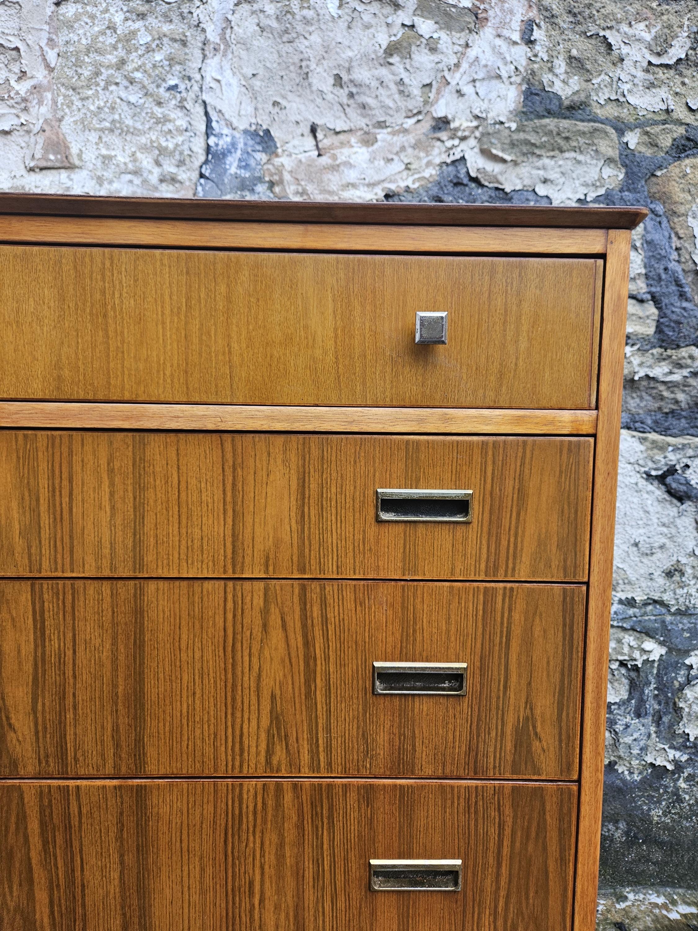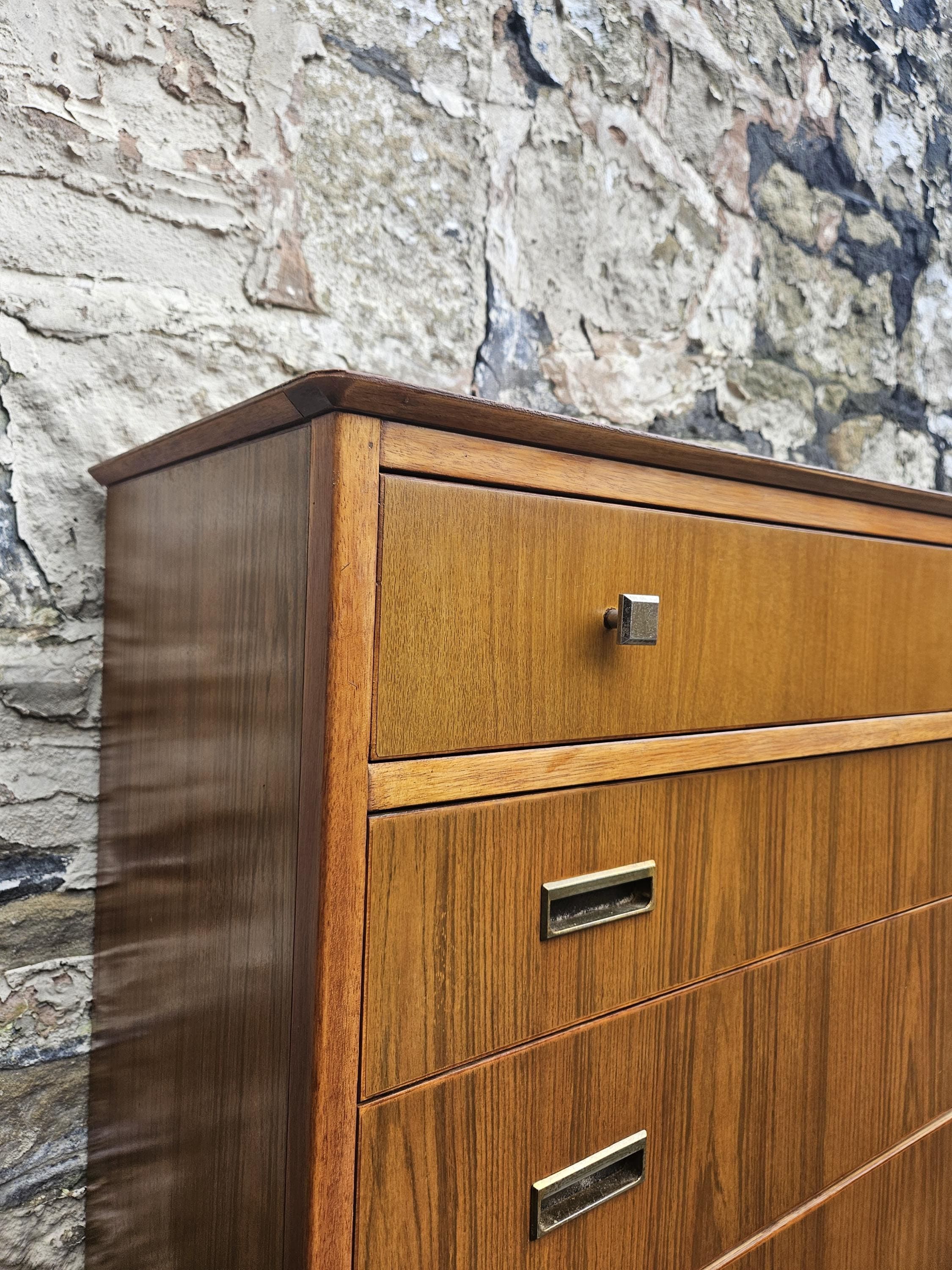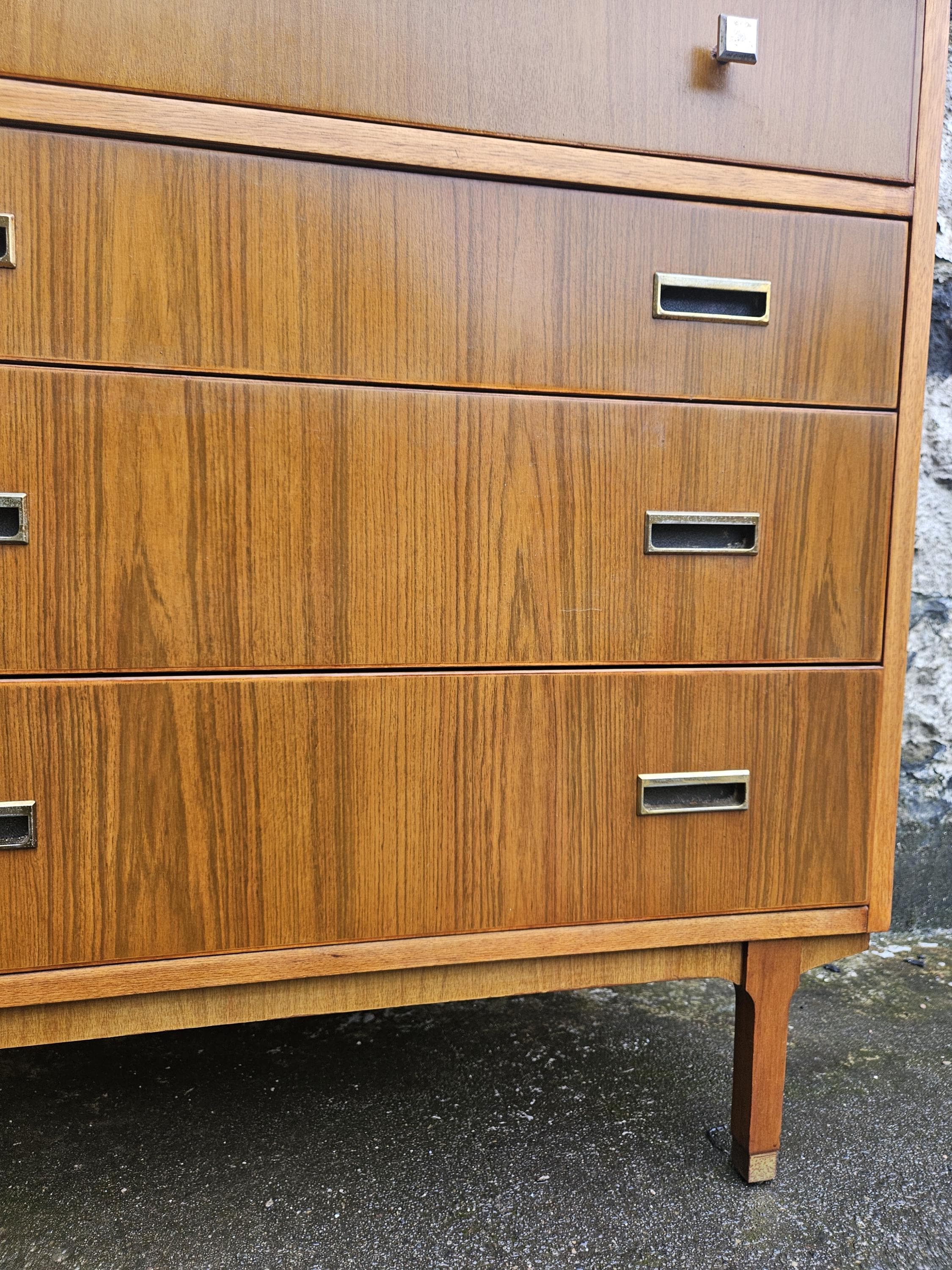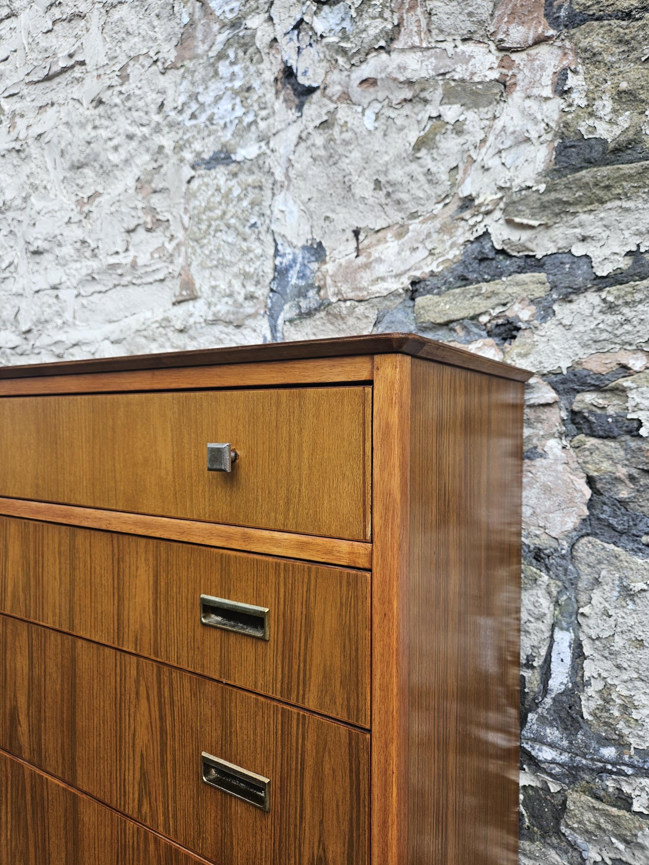 Mid Century Teak Chest of Drawers: Vintage Tallboy Cabinet Four Drawer With Brass Detailing