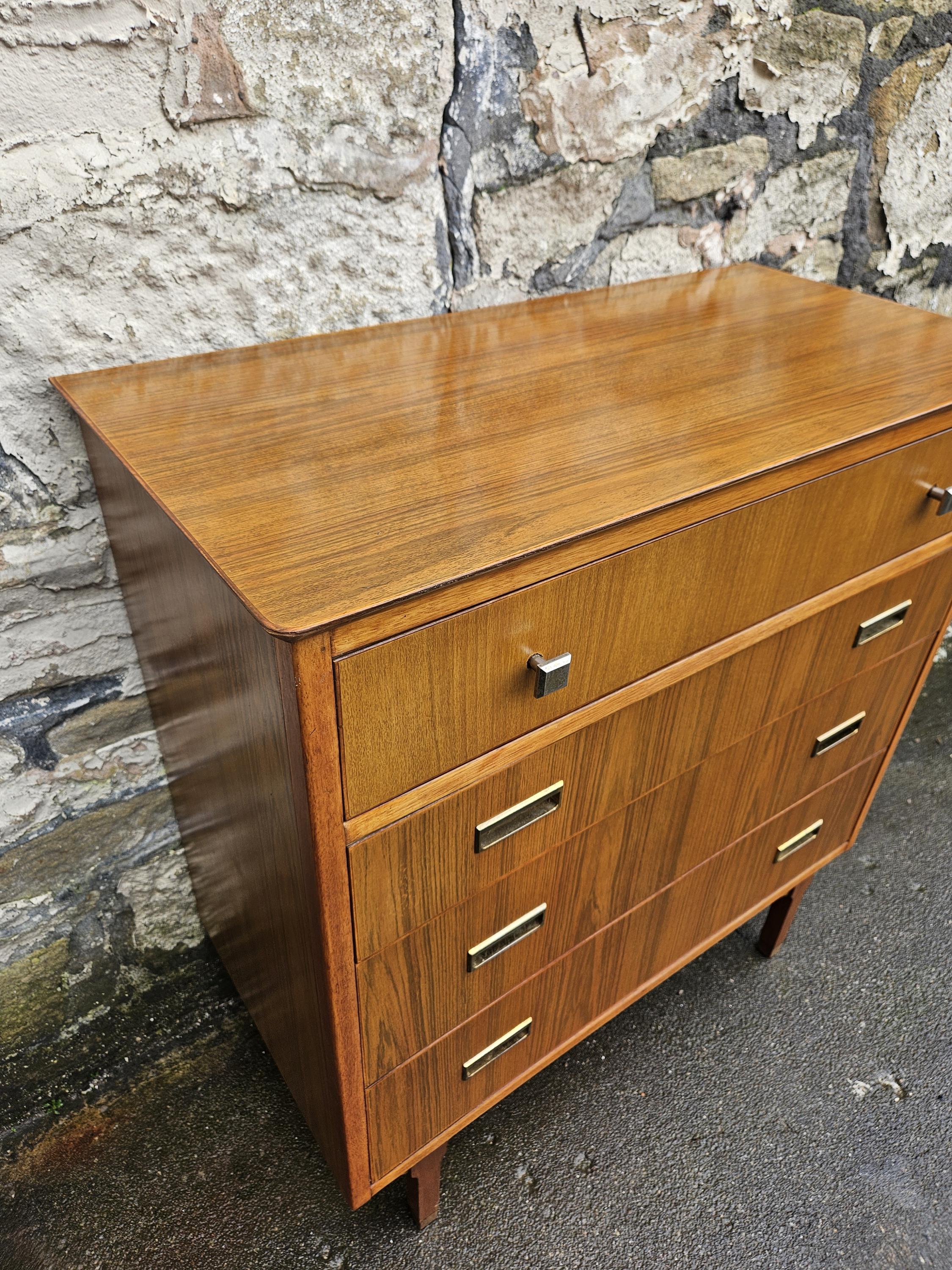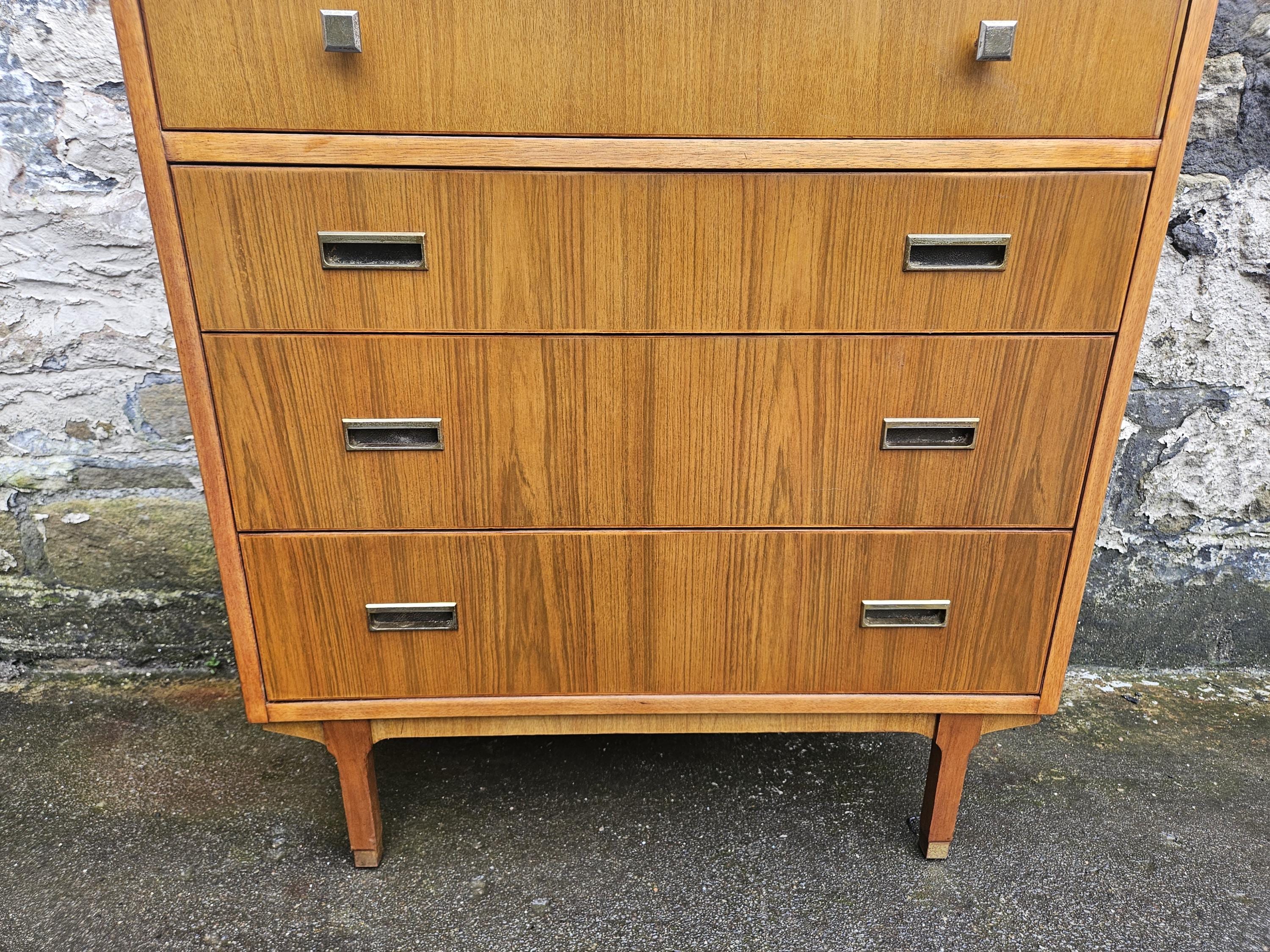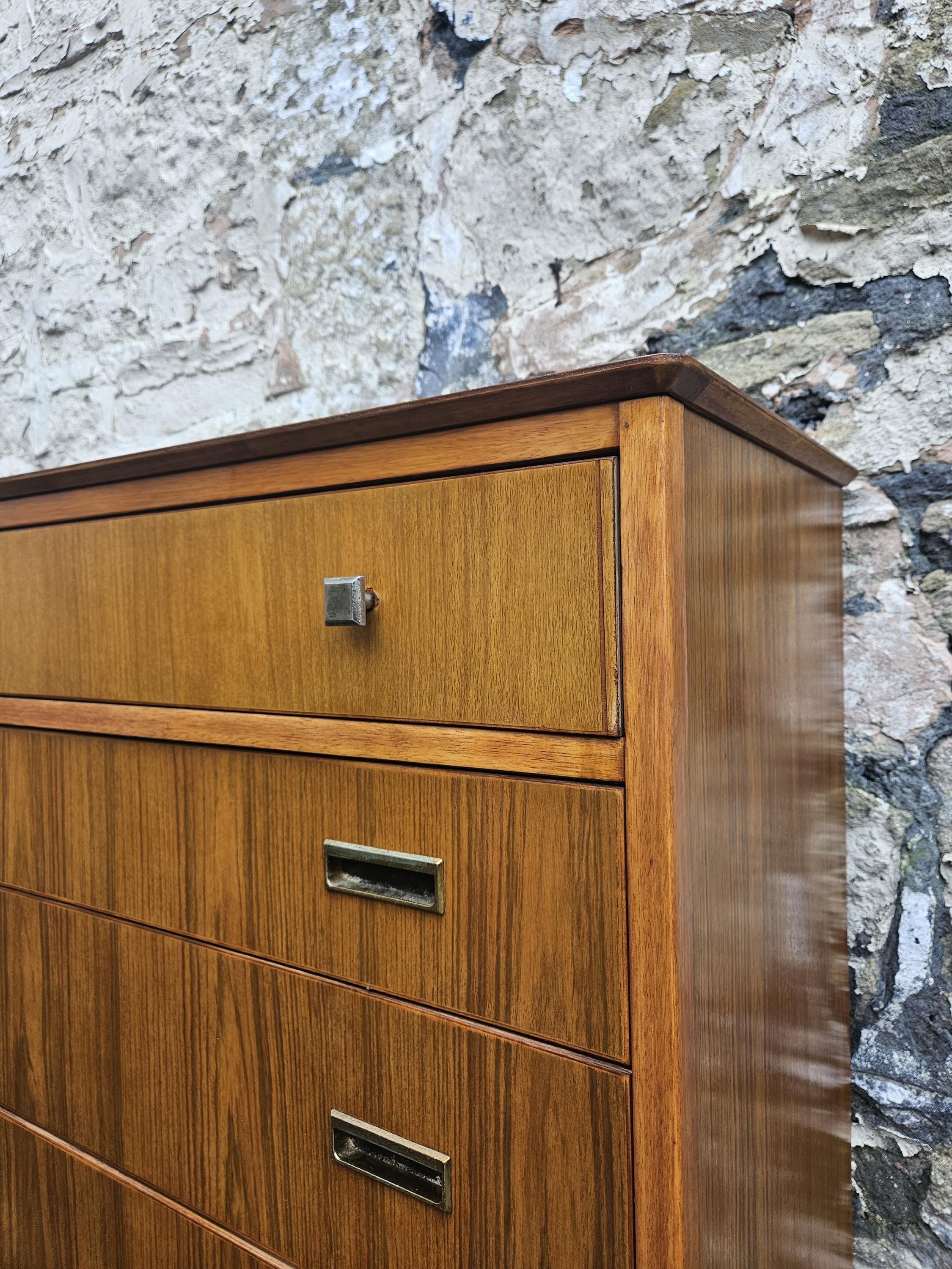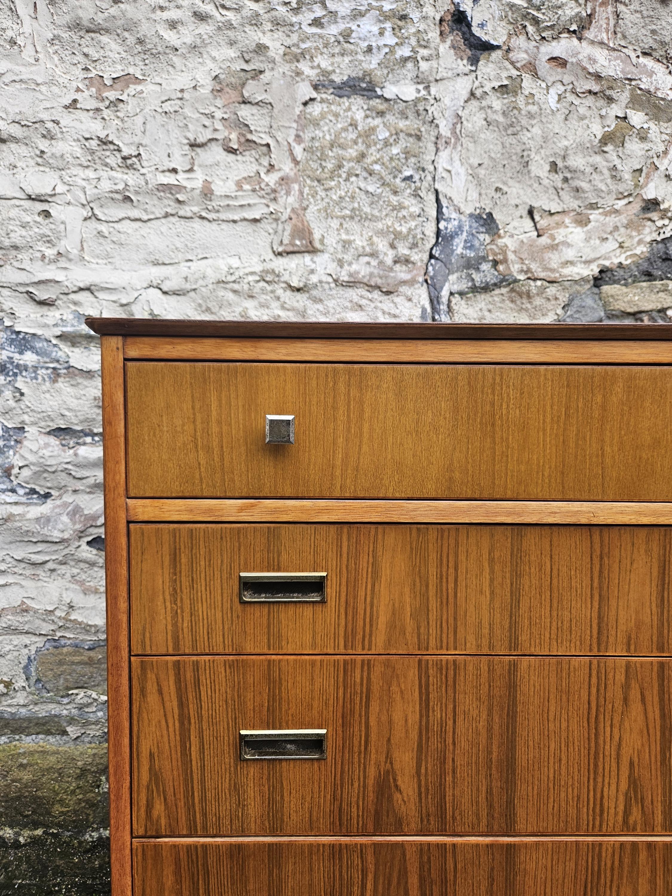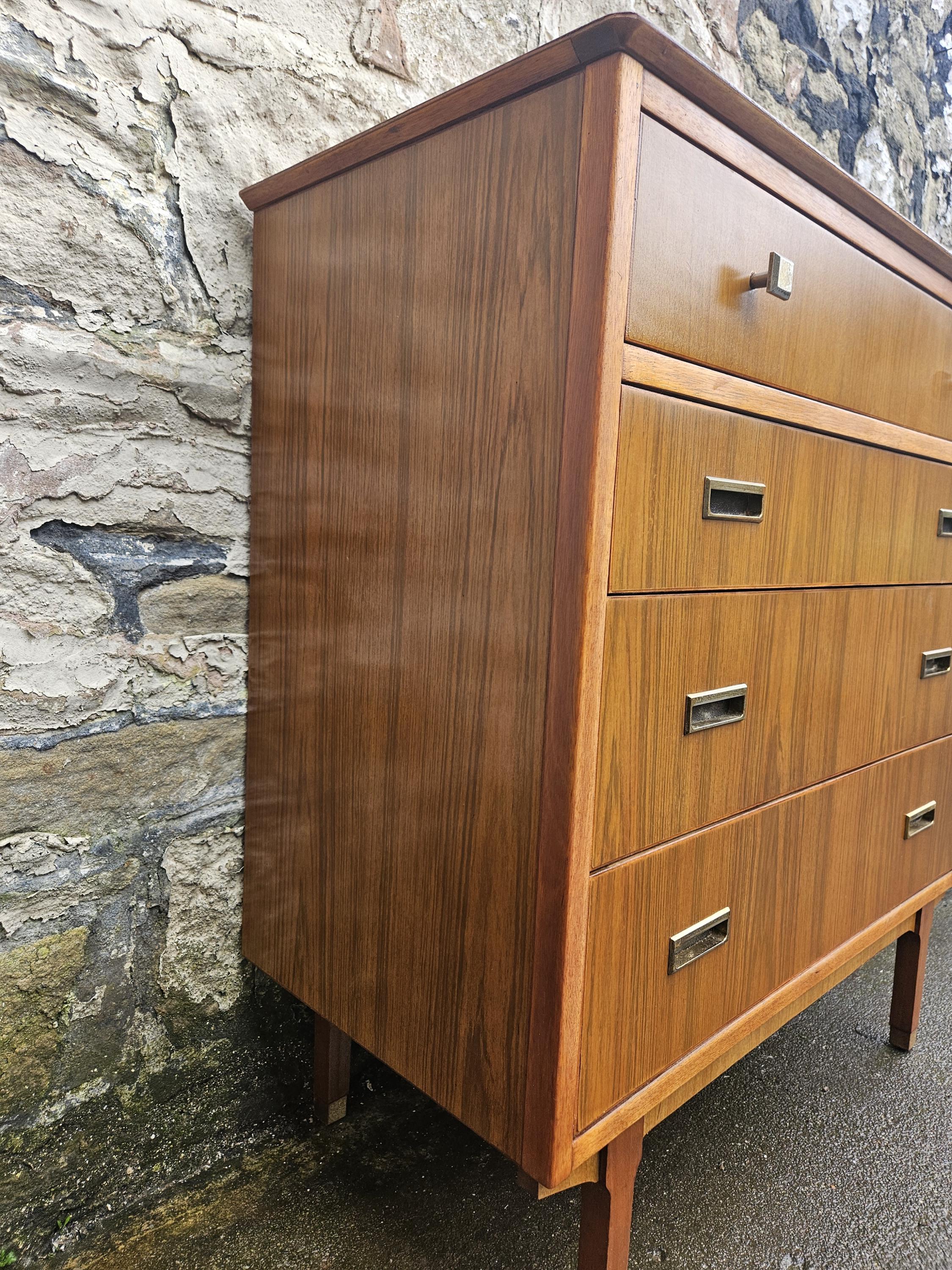 Mid Century Teak Chest of Drawers: Vintage Tallboy Cabinet Four Drawer With Brass Detailing