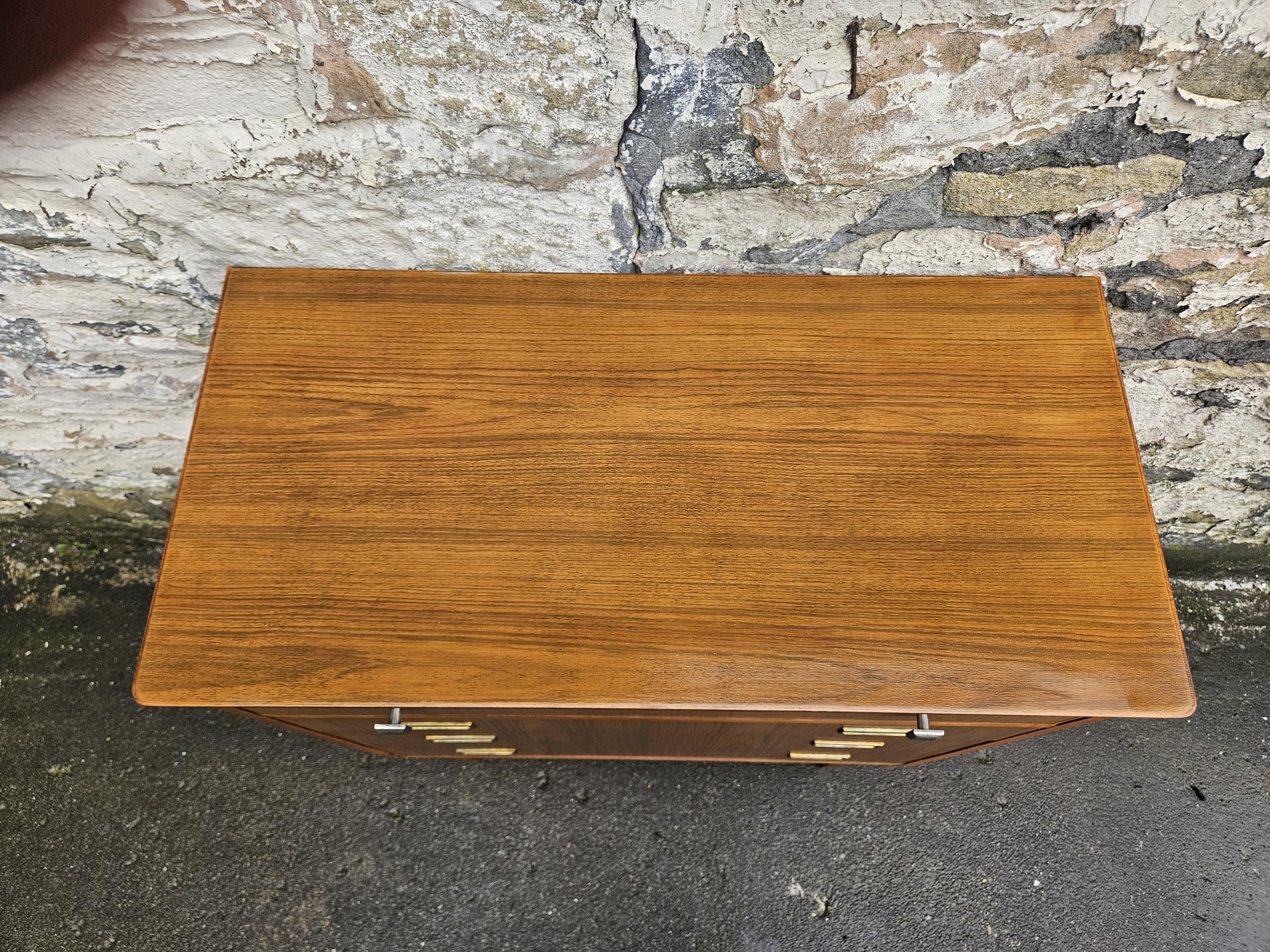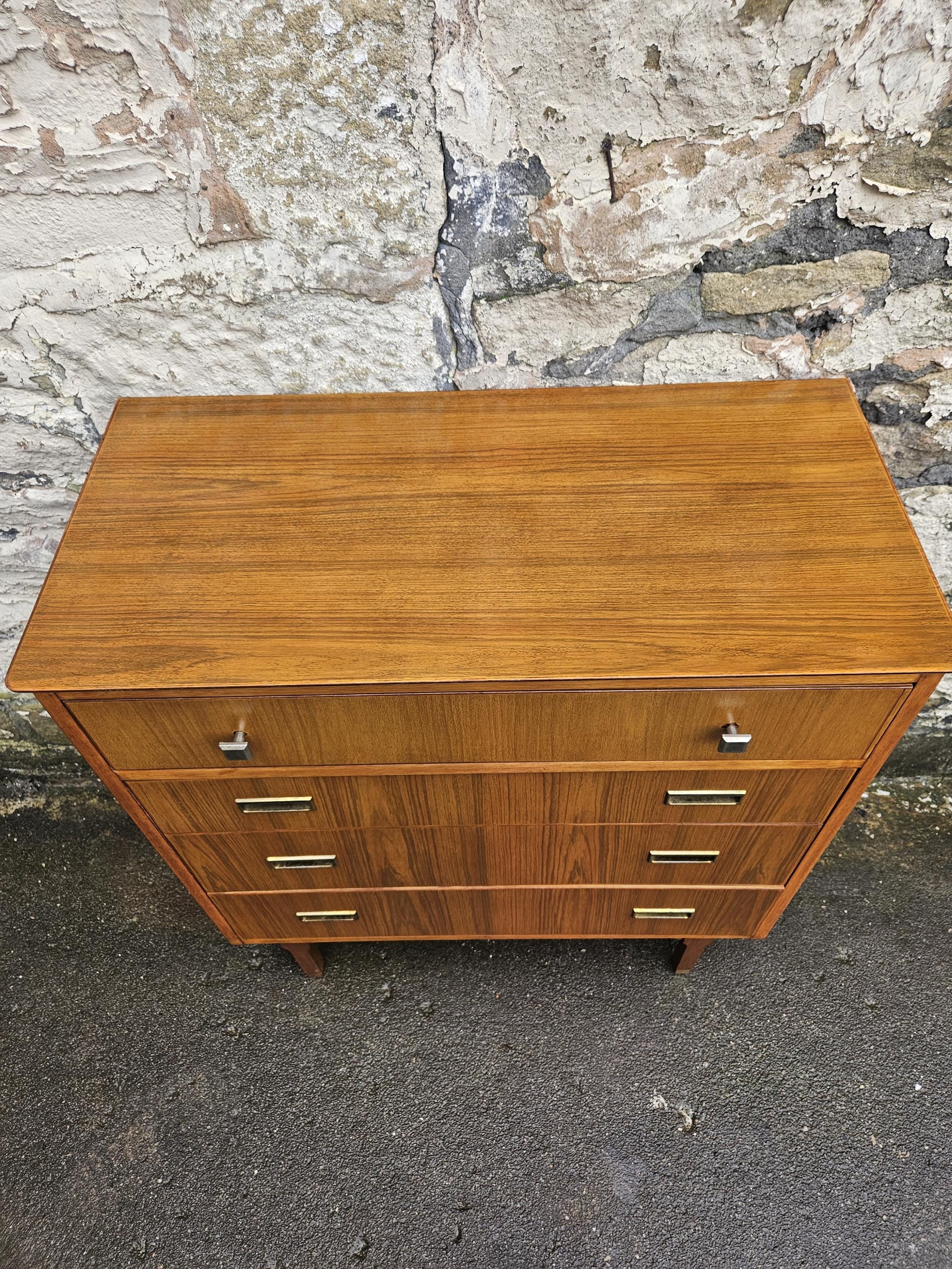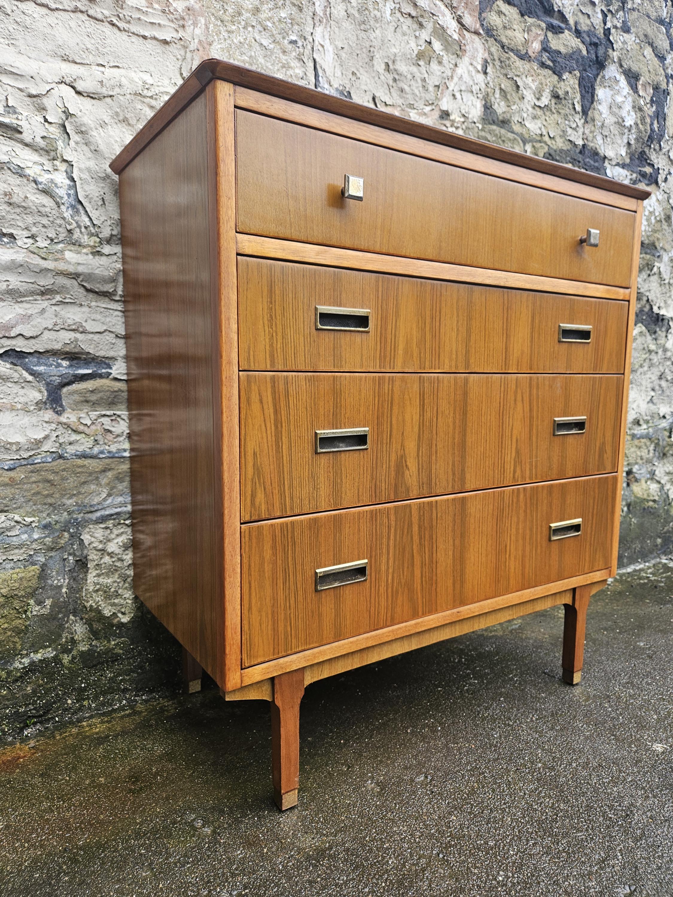 A stunning piece of vintage and mid-century furniture in four drawer teak chest of drawers. The cabinet consists of four hand crafted drawers with each drawer having superb dove tail jointing and offering excellent storage, on each of the drawer fronts there are the original handles with the top drawer having two square brass handles and the three lower drawers having two brass recessed handles, while to the base the cabinet sit's on four teak legs with brass end caps to each leg. The tallboy is a fabulous piece of vintage and mid century furniture crafted with various teak woods that really show the grain giving an amazing look and with a wonderful design and styling and with great proportions that would suit any home or environment