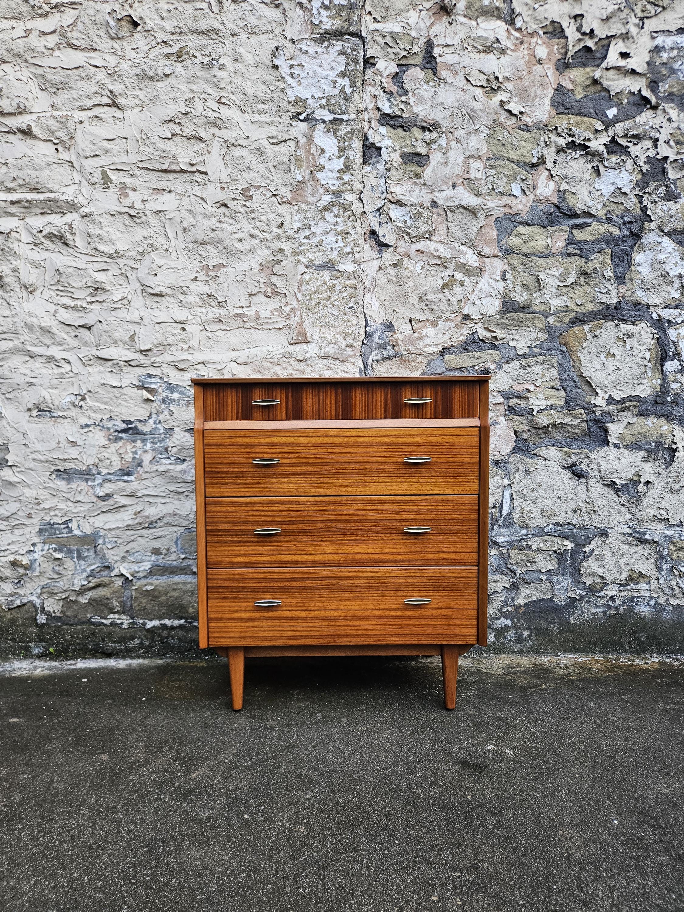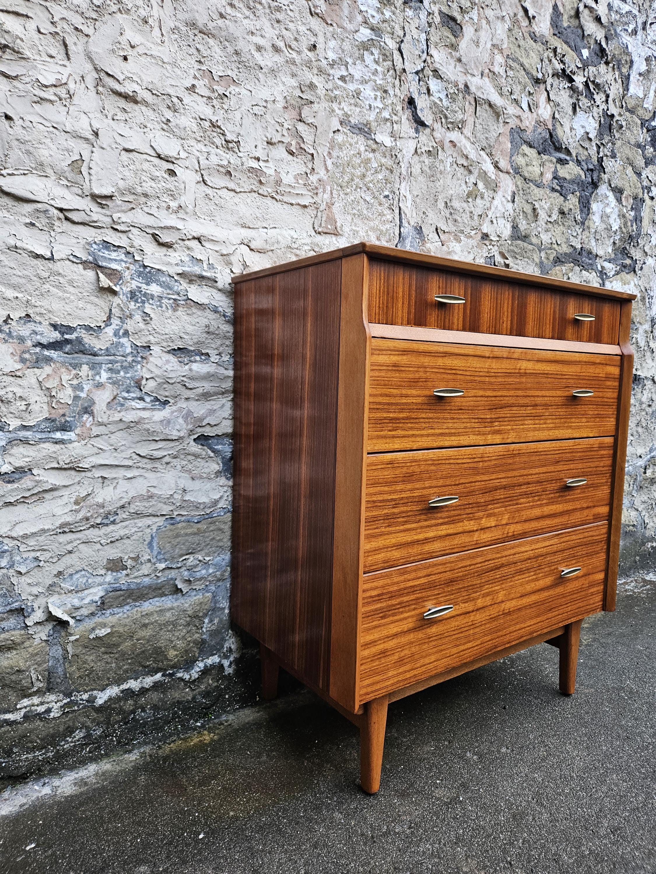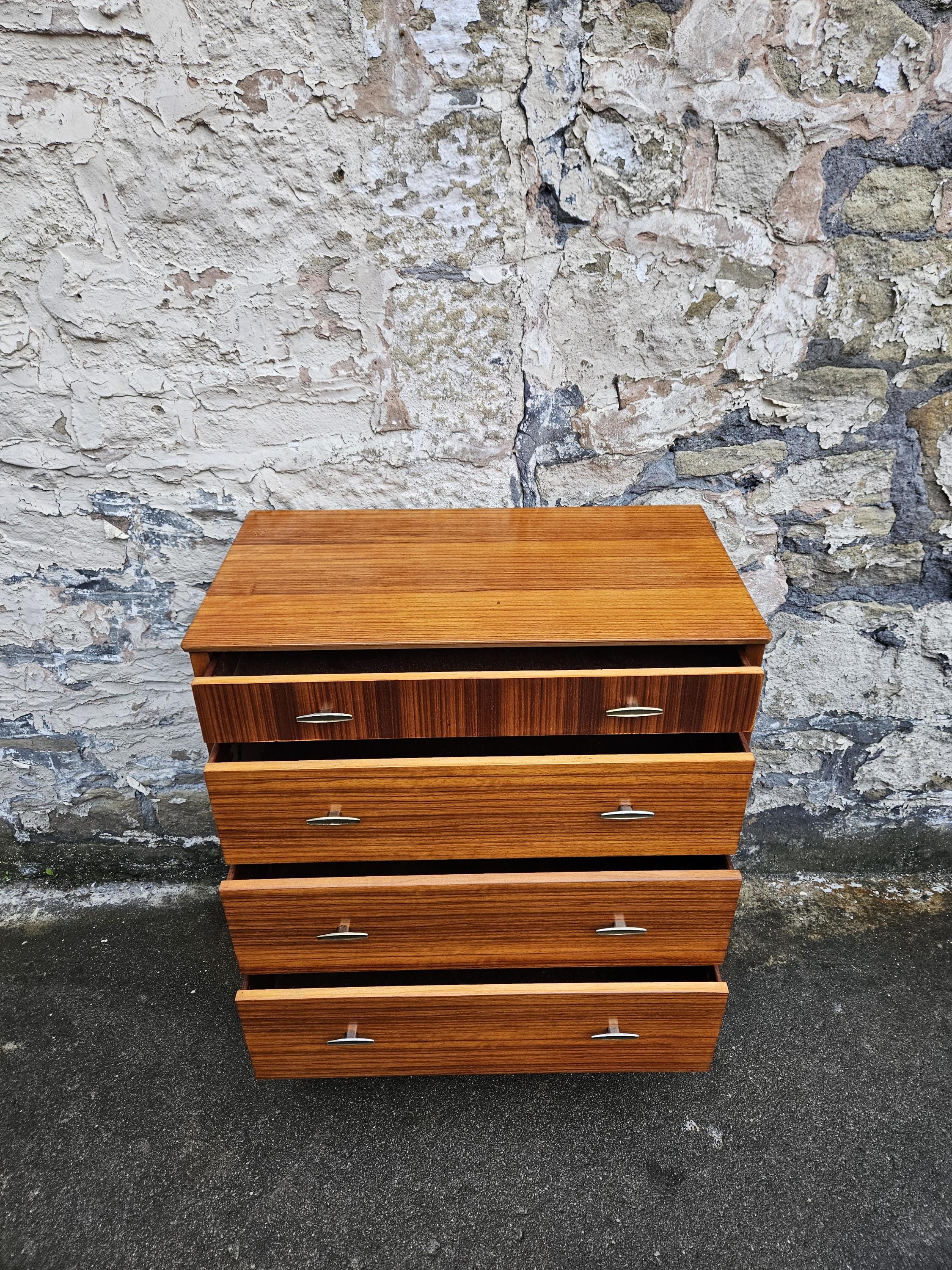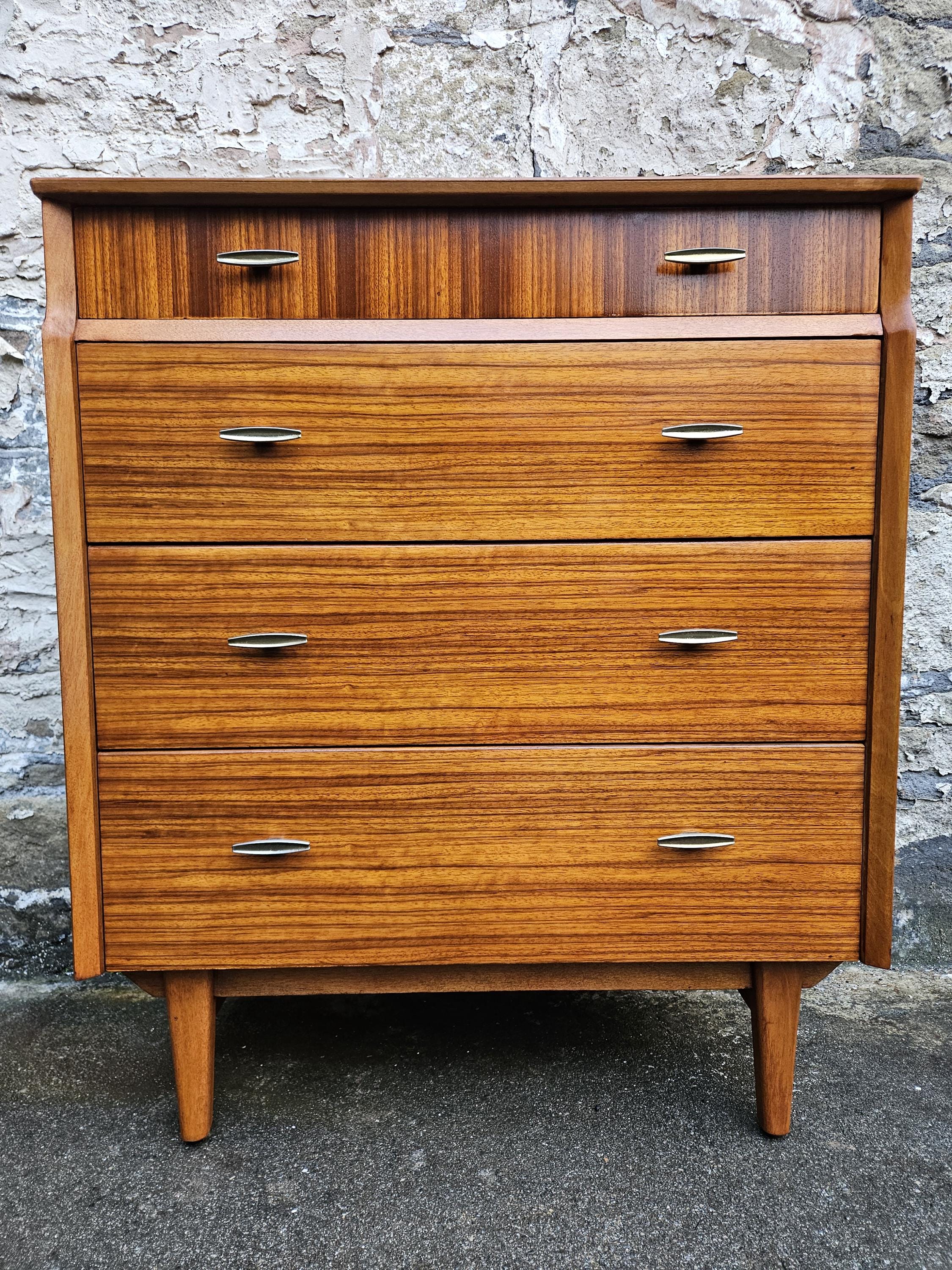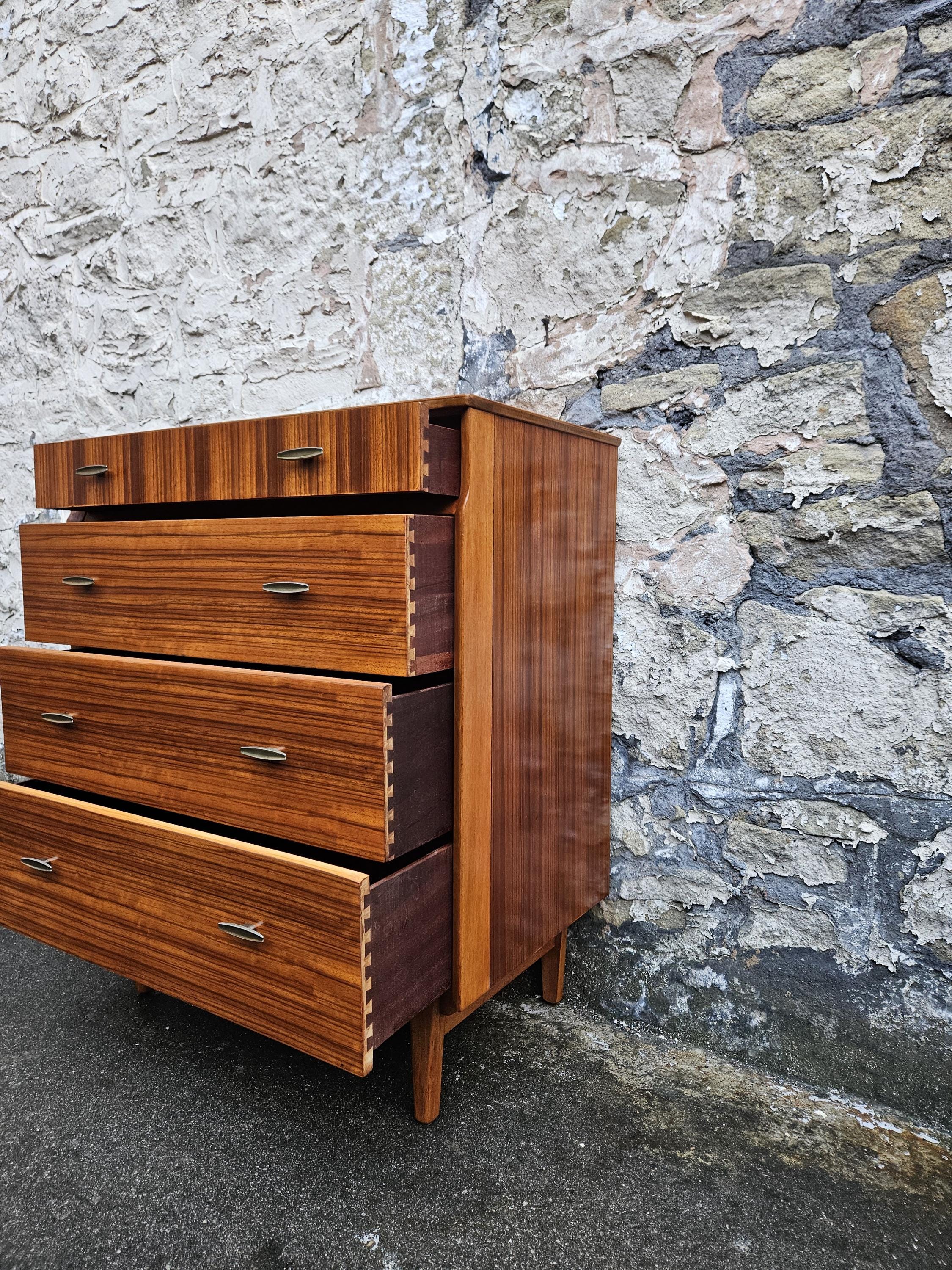 An amazing piece of vintage and mid century furniture in a four drawer chest by Lebus furniture. The chest of drawers consists of four hand crafted drawers with each one having superb dove tail jointing and offering excellent storage, on each drawer front there are two super stylized pull handles while to the base the cabinet sits on four beech legs with cross stretchers running in between. The cabinet has been crafted by Lebus furniture and bears their makers mark within the top drawer, The chest is a stunning and genuine piece of vintage and mid century furniture that looks amazing with a wonderful look and styling that would suit any home or environment