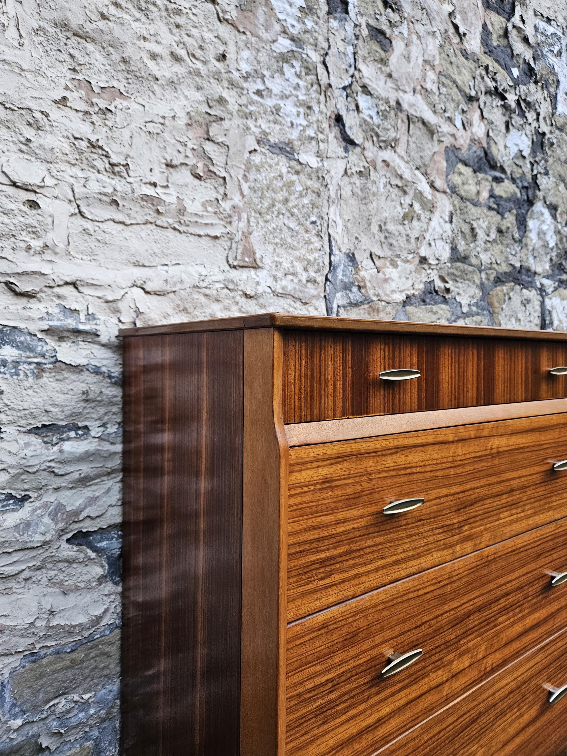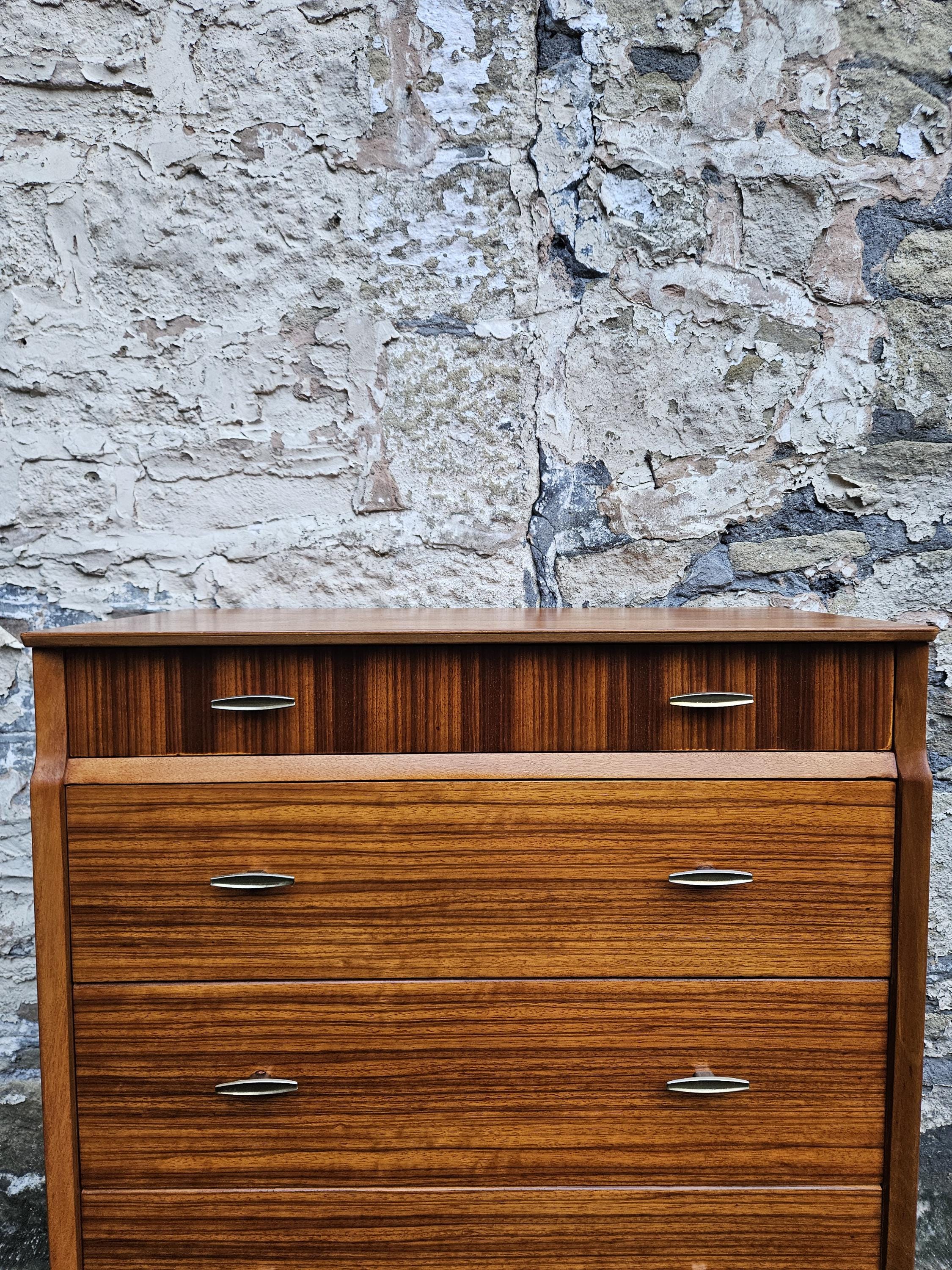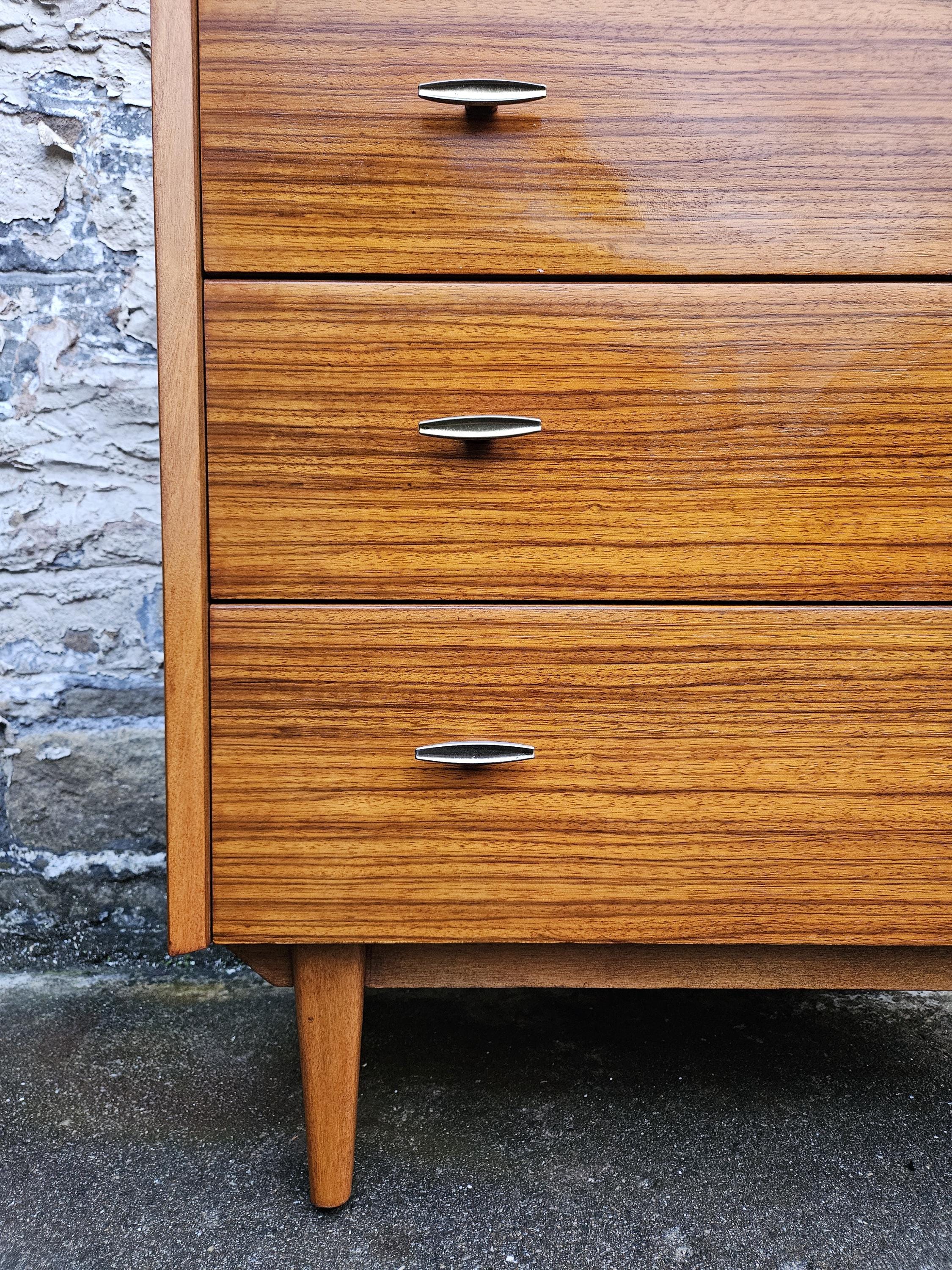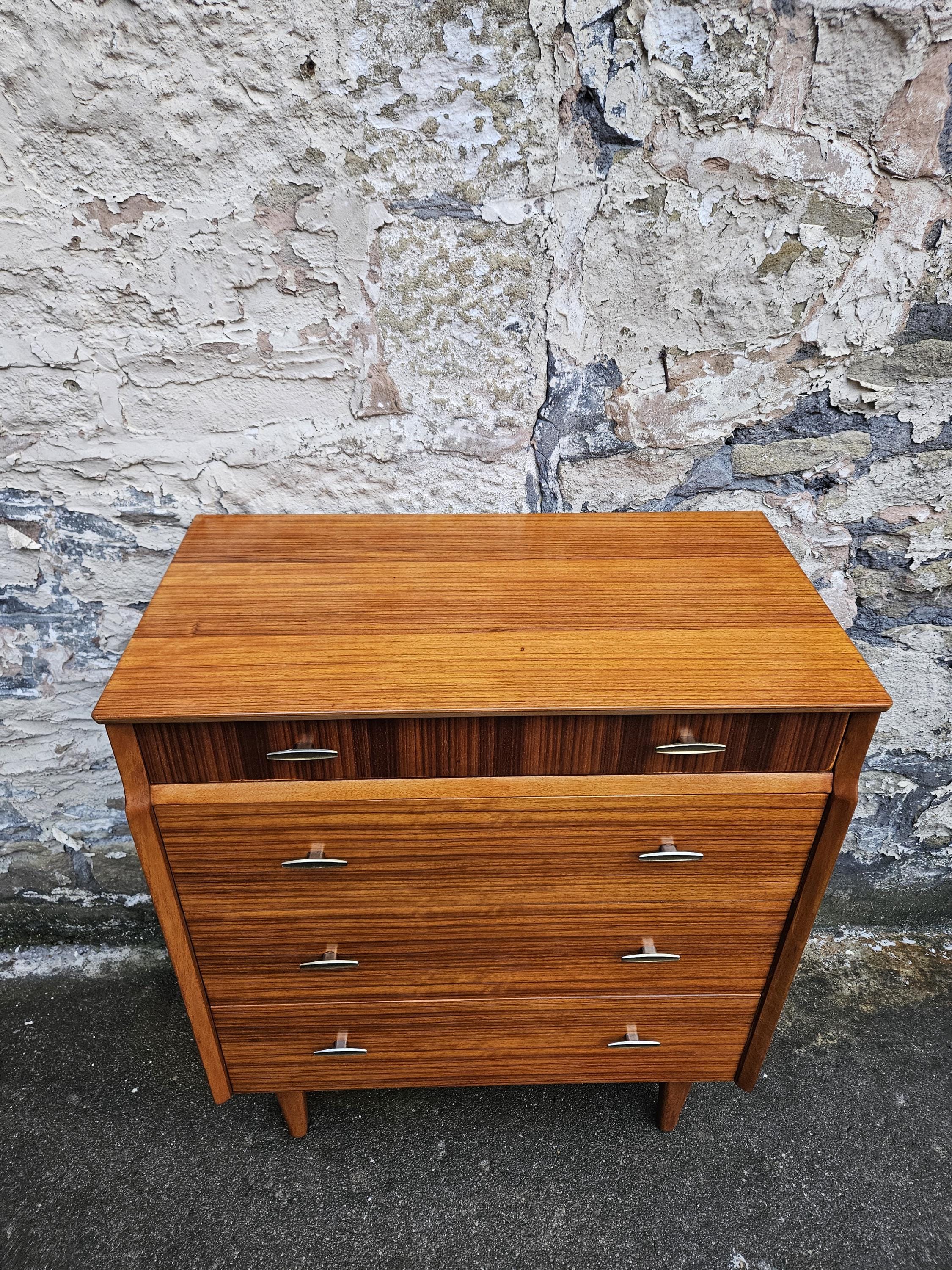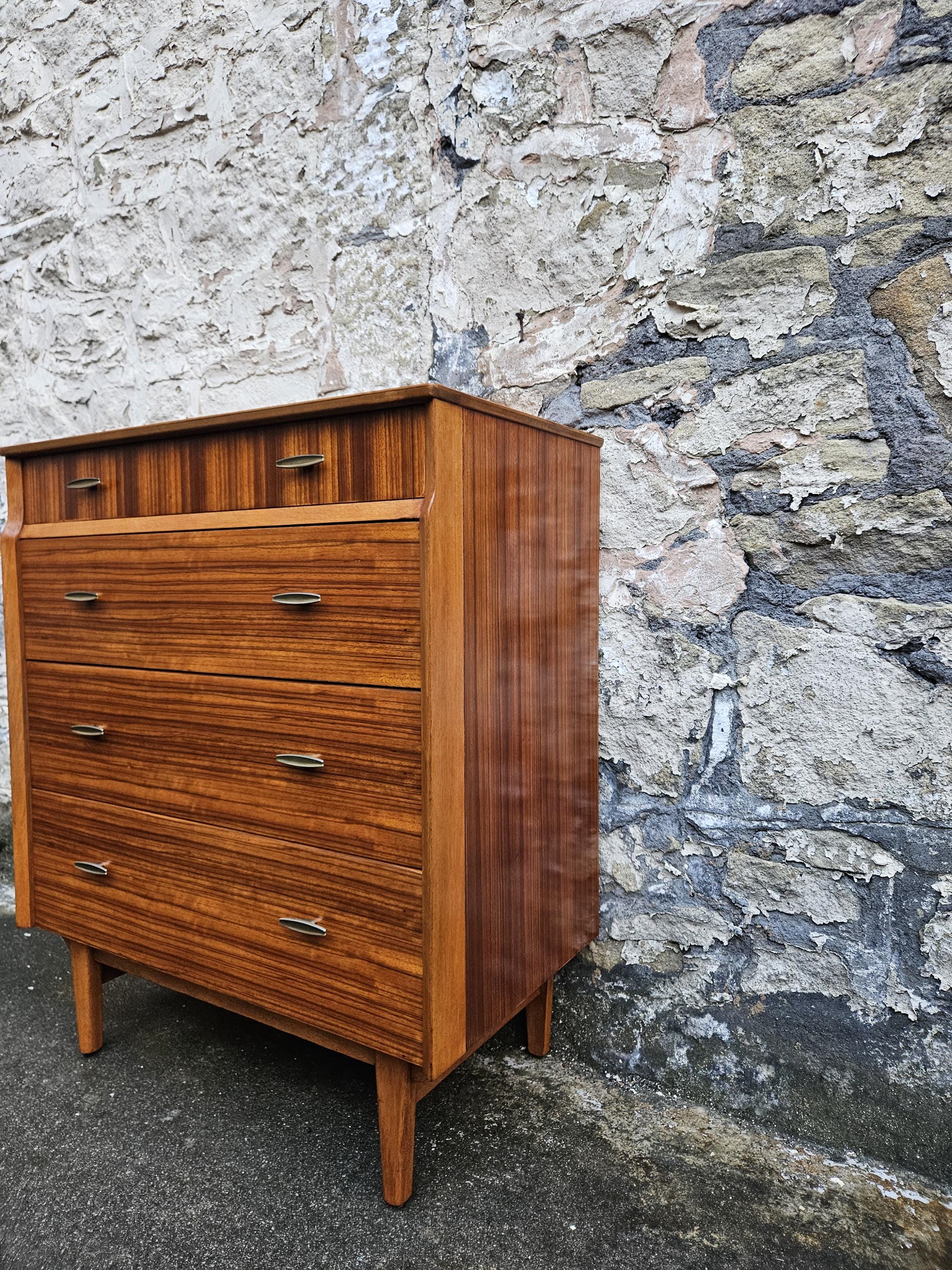 An amazing piece of vintage and mid century furniture in a four drawer chest by Lebus furniture. The chest of drawers consists of four hand crafted drawers with each one having superb dove tail jointing and offering excellent storage, on each drawer front there are two super stylized pull handles while to the base the cabinet sits on four beech legs with cross stretchers running in between. The cabinet has been crafted by Lebus furniture and bears their makers mark within the top drawer, The chest is a stunning and genuine piece of vintage and mid century furniture that looks amazing with a wonderful look and styling that would suit any home or environment