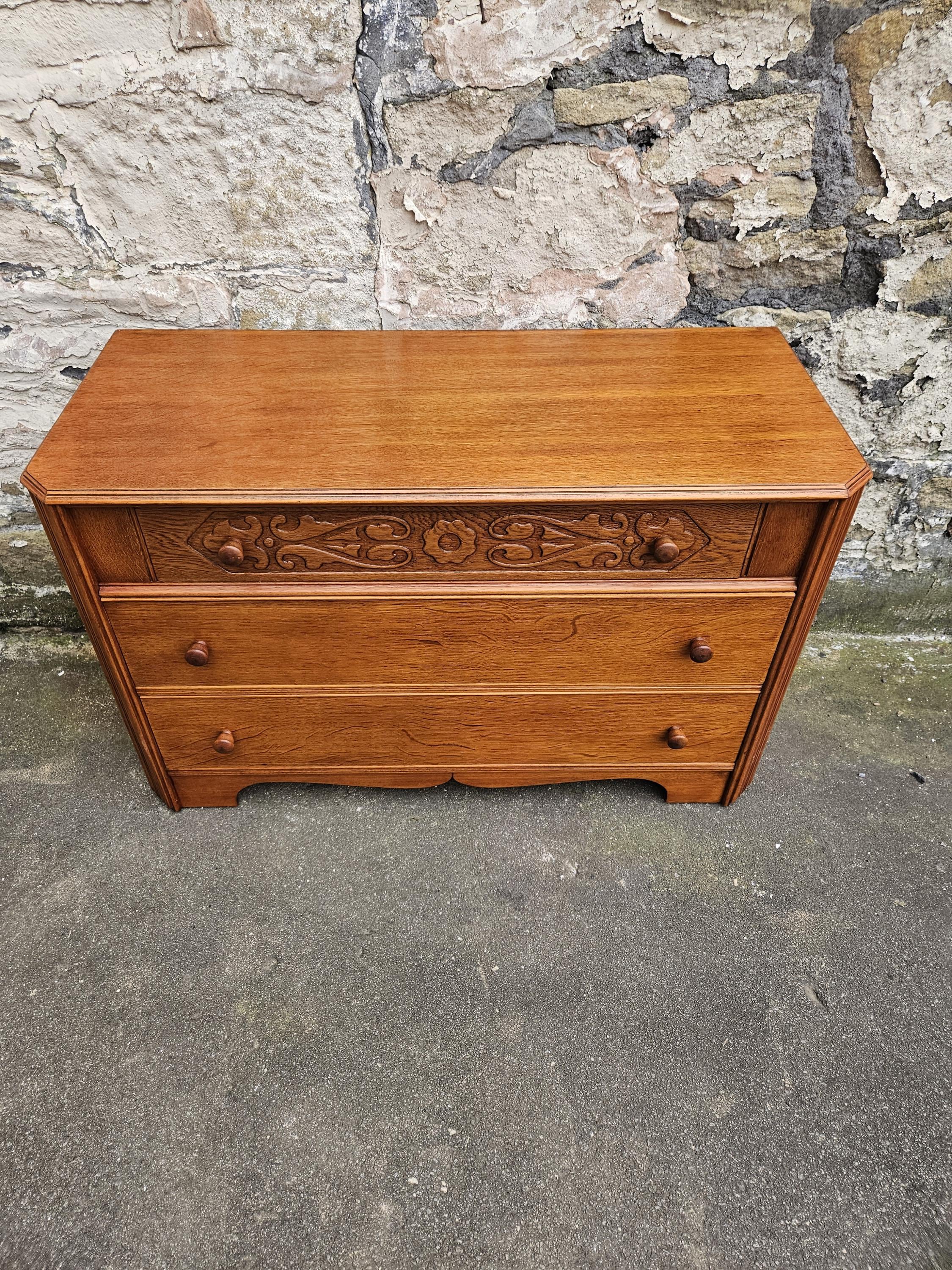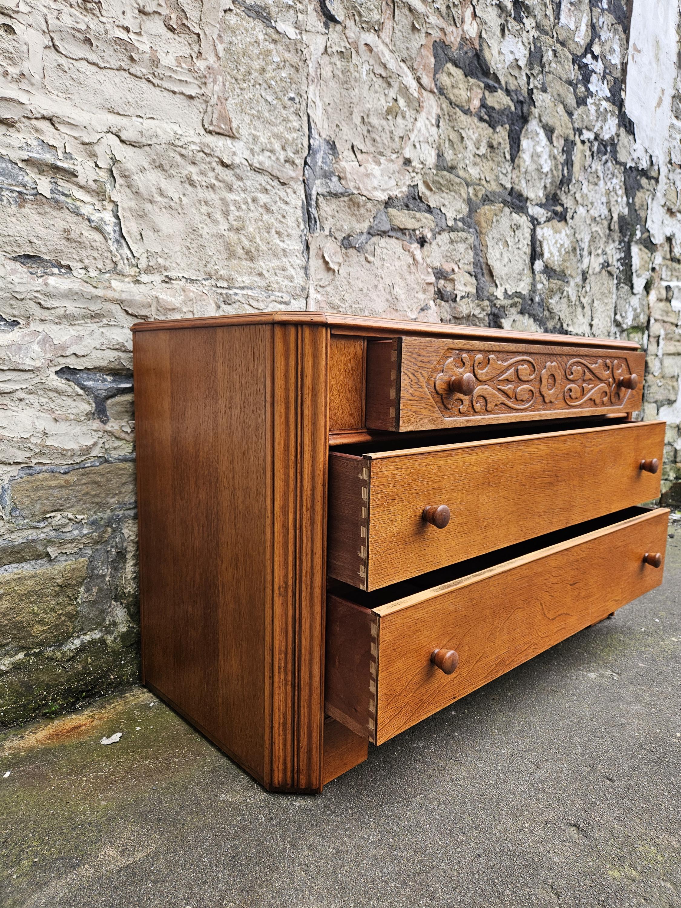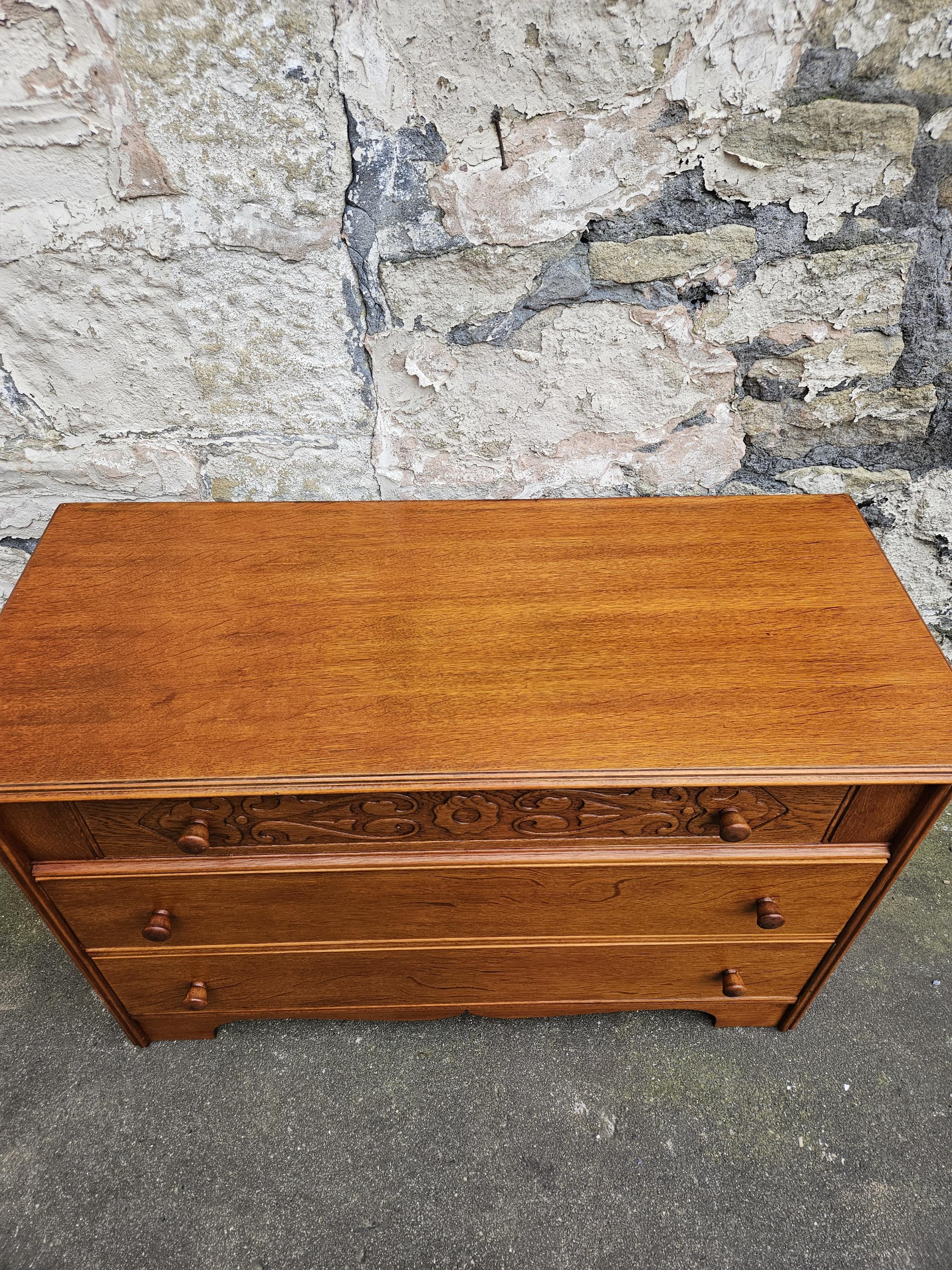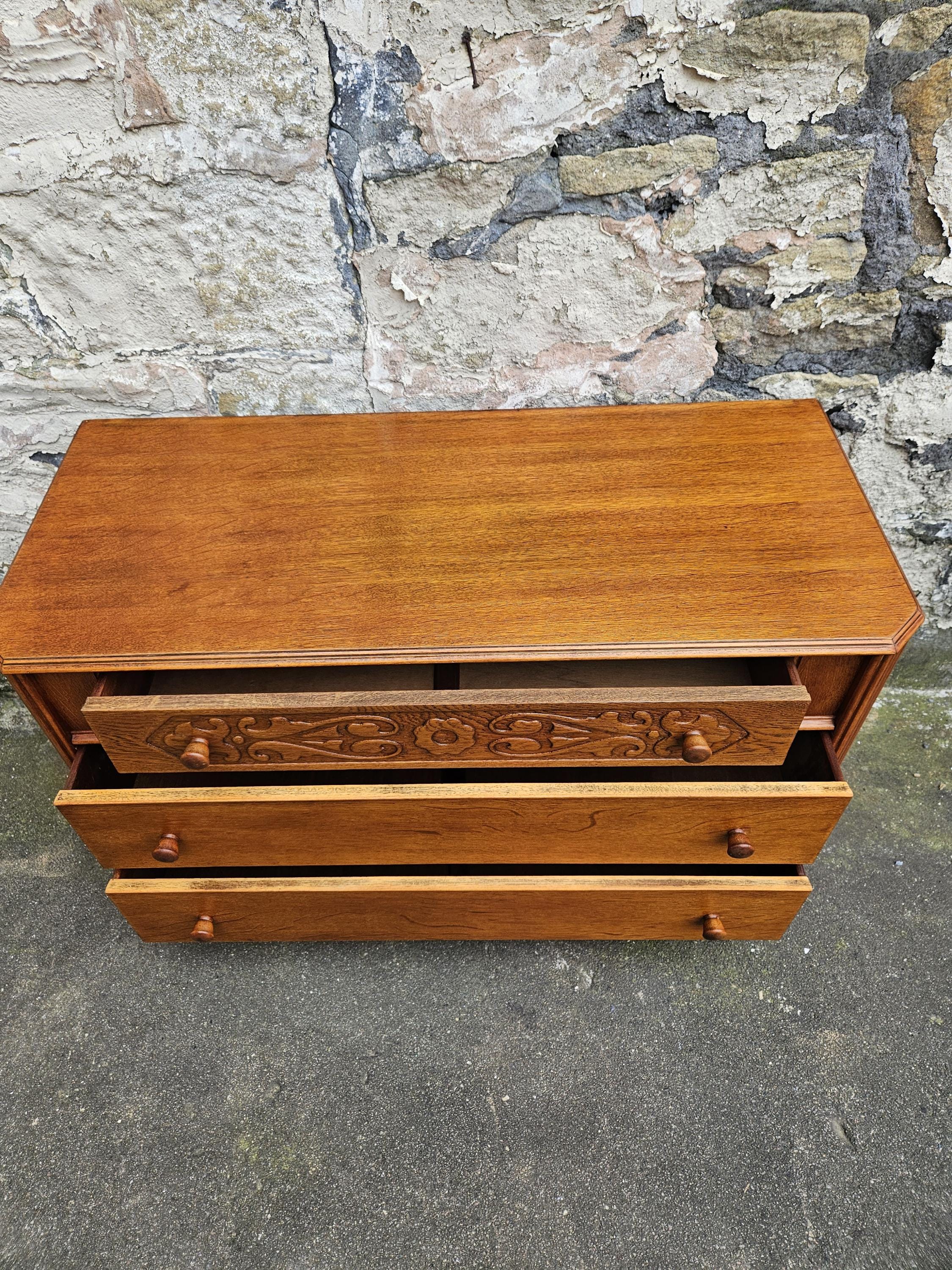 A stunning piece of vintage and antique furniture in a three drawer oak chest by Austinsuite furniture. The cabinet consists of three hand crafted drawers with each drawer having superb dove tail jointing and offering excellent storage. To each of the drawer fronts there are two wooden pull handles. The cabinet has superb carved detailing running through out the chest with a beautiful carved decoration within the top drawer in a floral design angled sides with a column design within the centre and a oak scalloped edge running along the bottom. The chest has been hand crafted by Austinsuite and is a wonderful piece of vintage and antique furniture with great proportions, a beautiful oak colour and a superb look and design that would suit any home or environment.