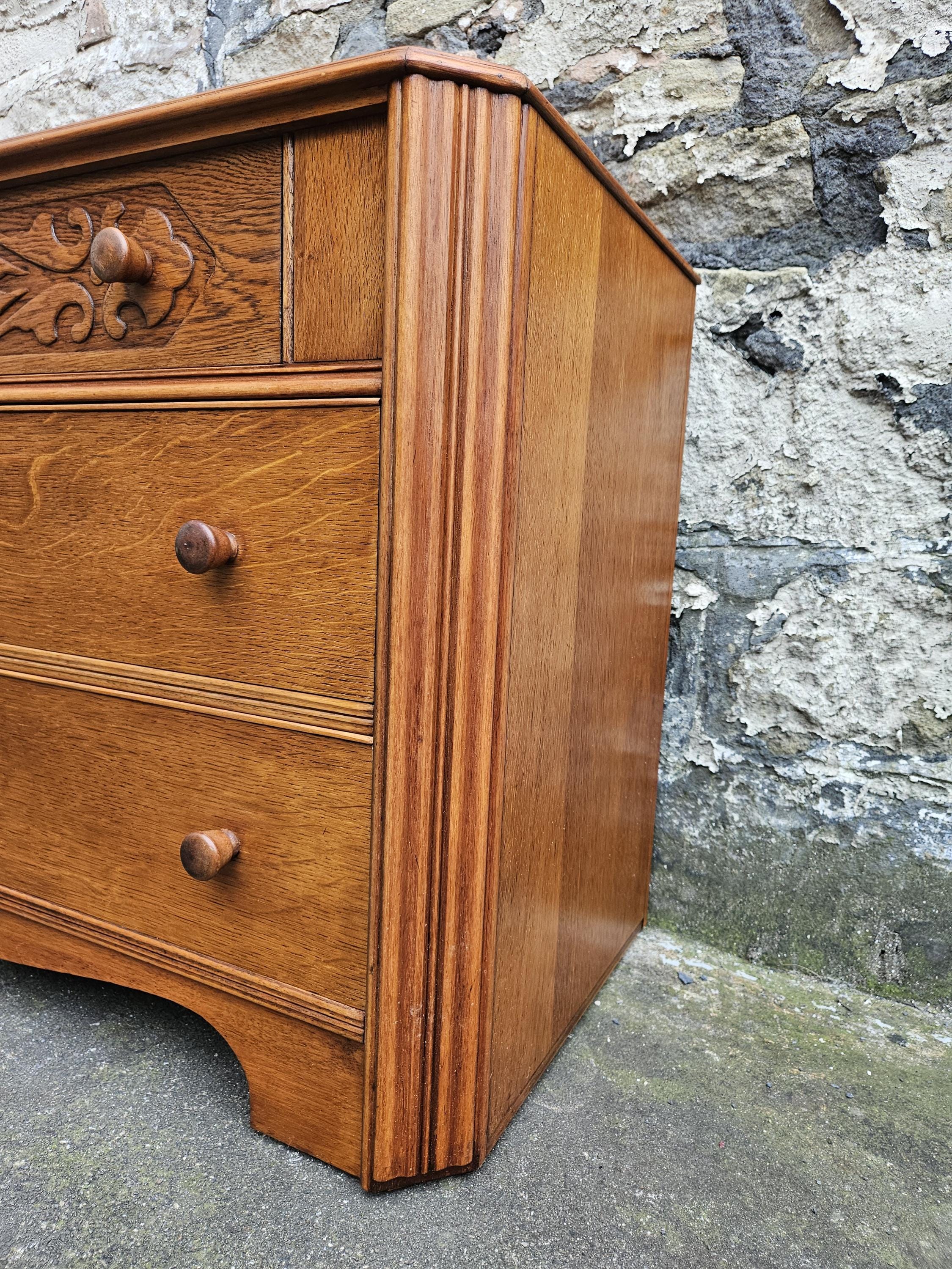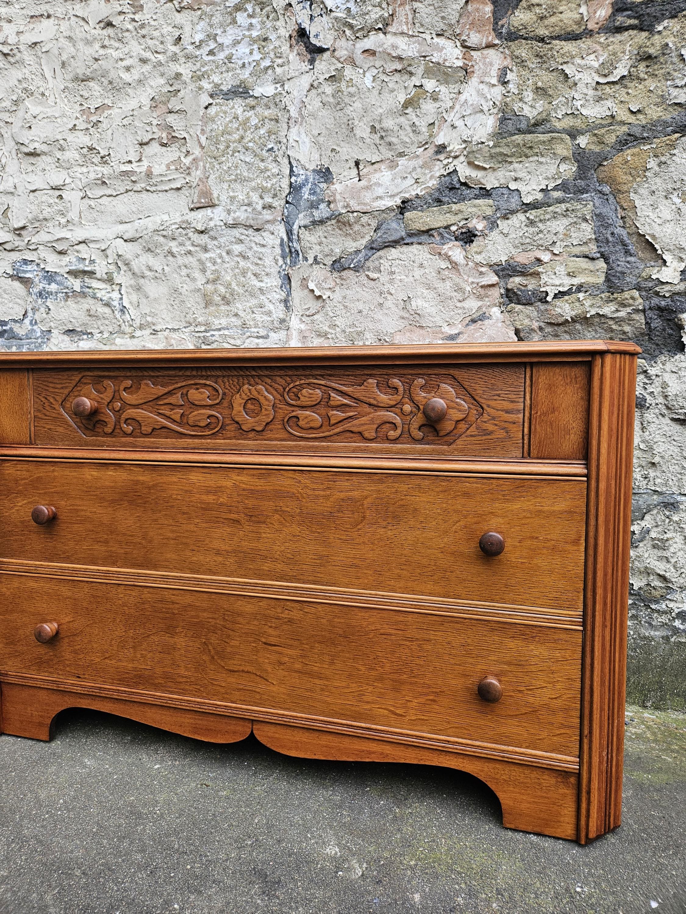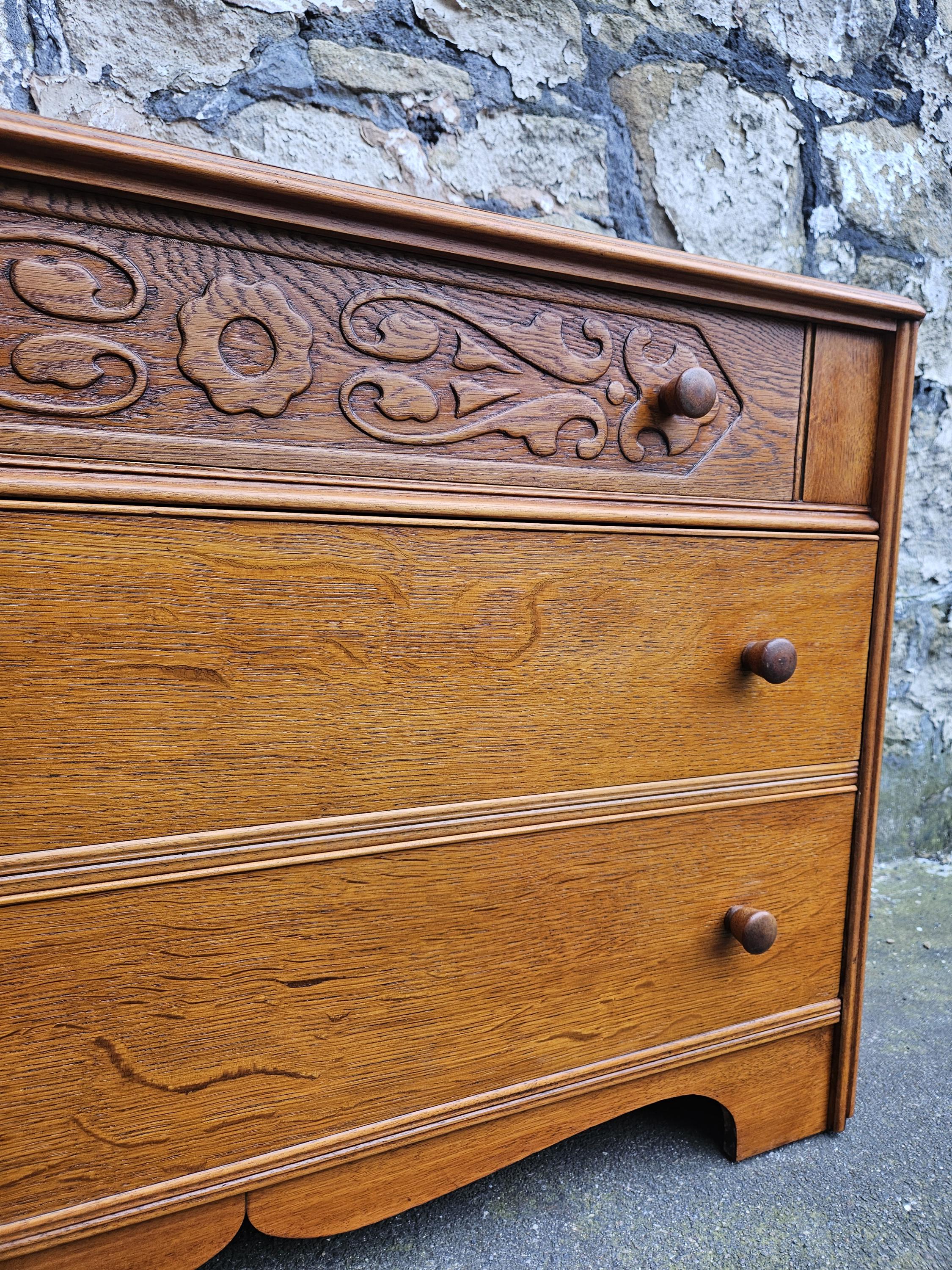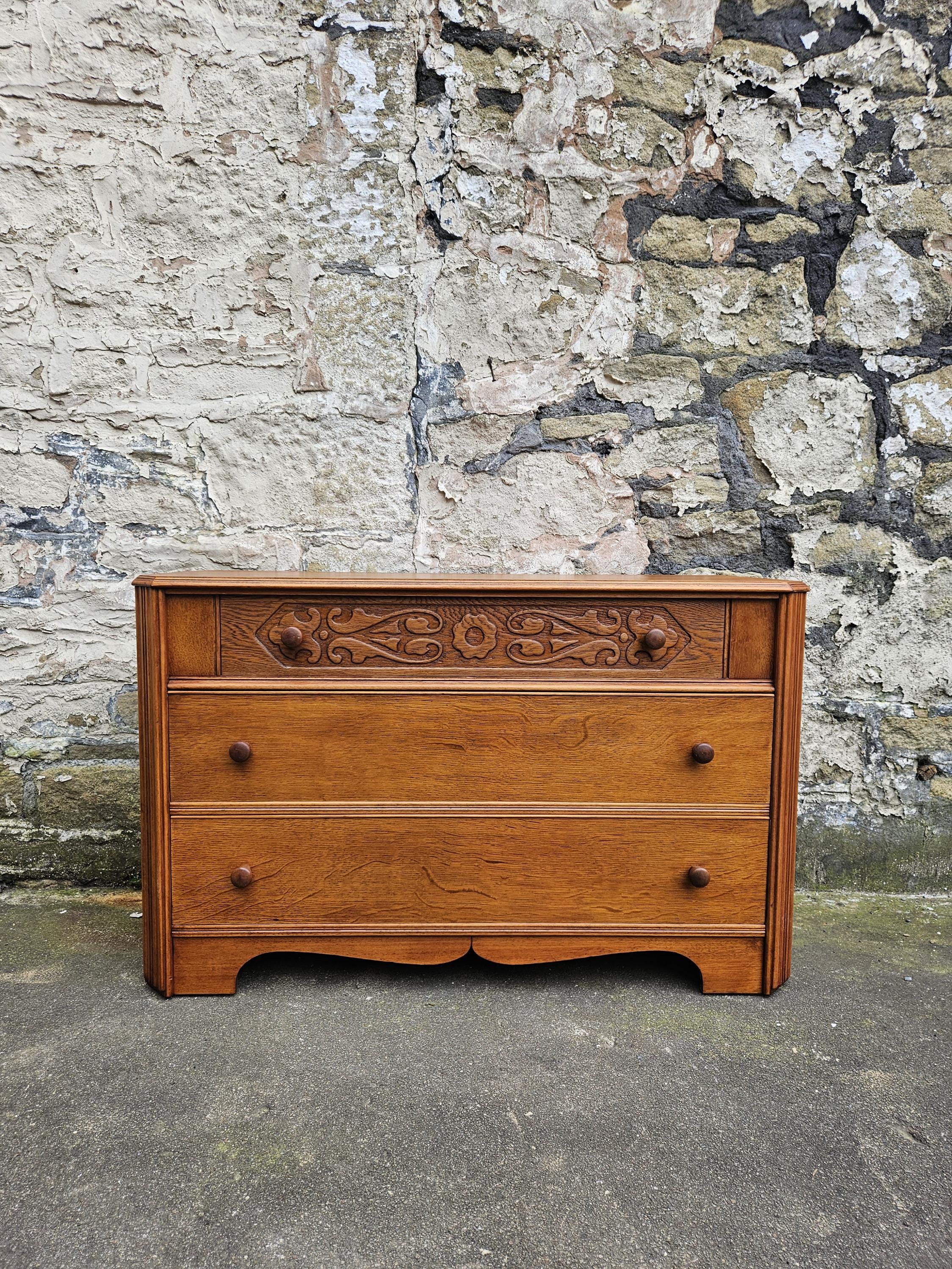 A stunning piece of vintage and antique furniture in a three drawer oak chest by Austinsuite furniture. The cabinet consists of three hand crafted drawers with each drawer having superb dove tail jointing and offering excellent storage. To each of the drawer fronts there are two wooden pull handles. The cabinet has superb carved detailing running through out the chest with a beautiful carved decoration within the top drawer in a floral design angled sides with a column design within the centre and a oak scalloped edge running along the bottom. The chest has been hand crafted by Austinsuite and is a wonderful piece of vintage and antique furniture with great proportions, a beautiful oak colour and a superb look and design that would suit any home or environment.