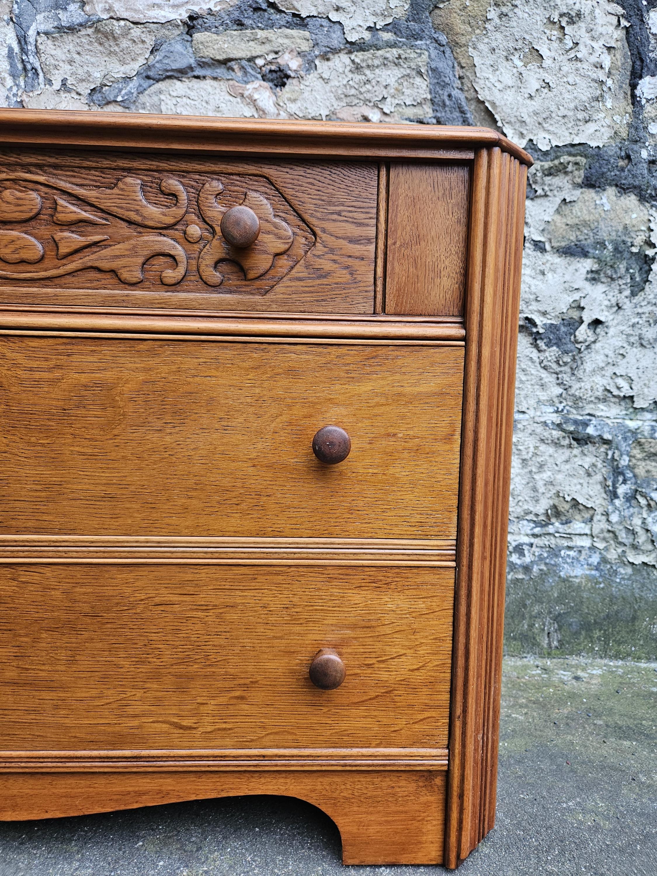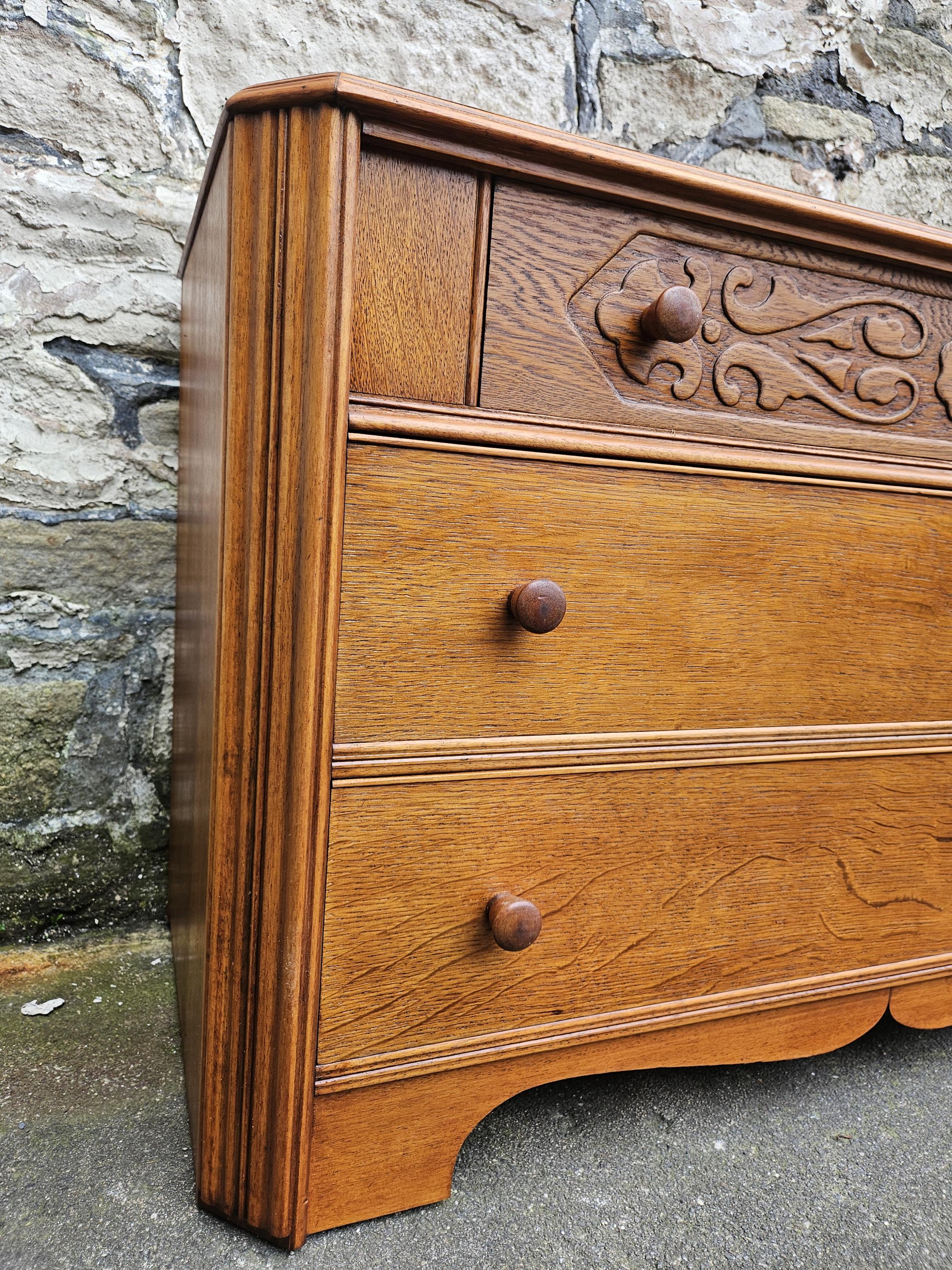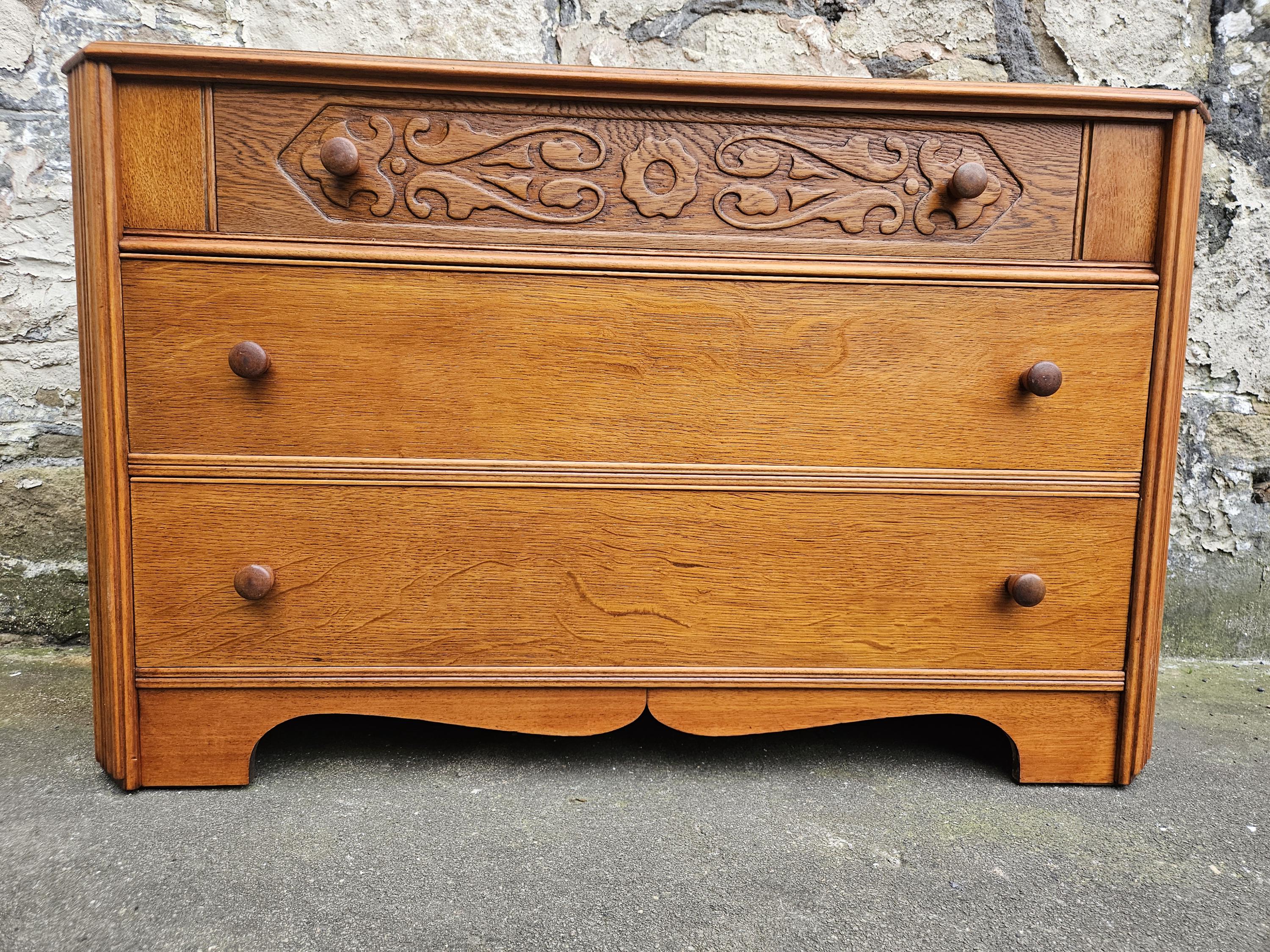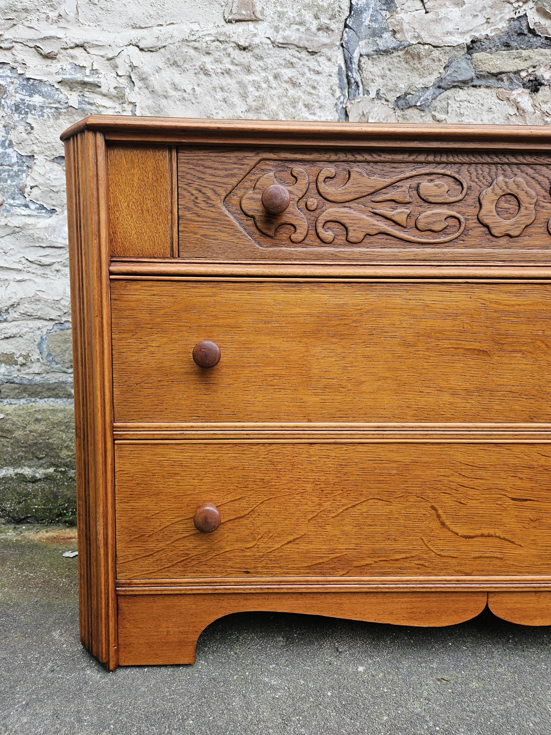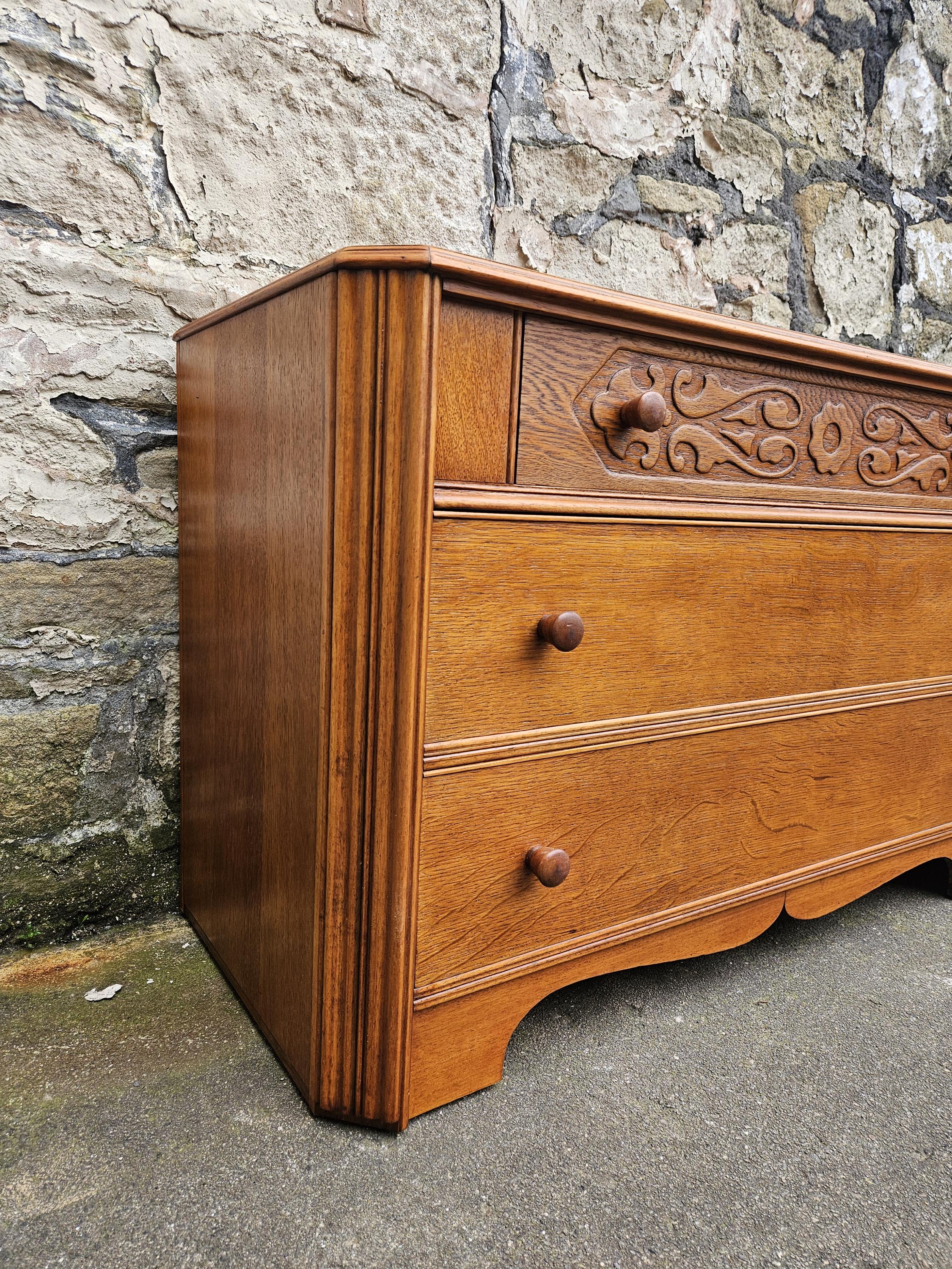 A stunning piece of vintage and antique furniture in a three drawer oak chest by Austinsuite furniture. The cabinet consists of three hand crafted drawers with each drawer having superb dove tail jointing and offering excellent storage. To each of the drawer fronts there are two wooden pull handles. The cabinet has superb carved detailing running through out the chest with a beautiful carved decoration within the top drawer in a floral design angled sides with a column design within the centre and a oak scalloped edge running along the bottom. The chest has been hand crafted by Austinsuite and is a wonderful piece of vintage and antique furniture with great proportions, a beautiful oak colour and a superb look and design that would suit any home or environment.