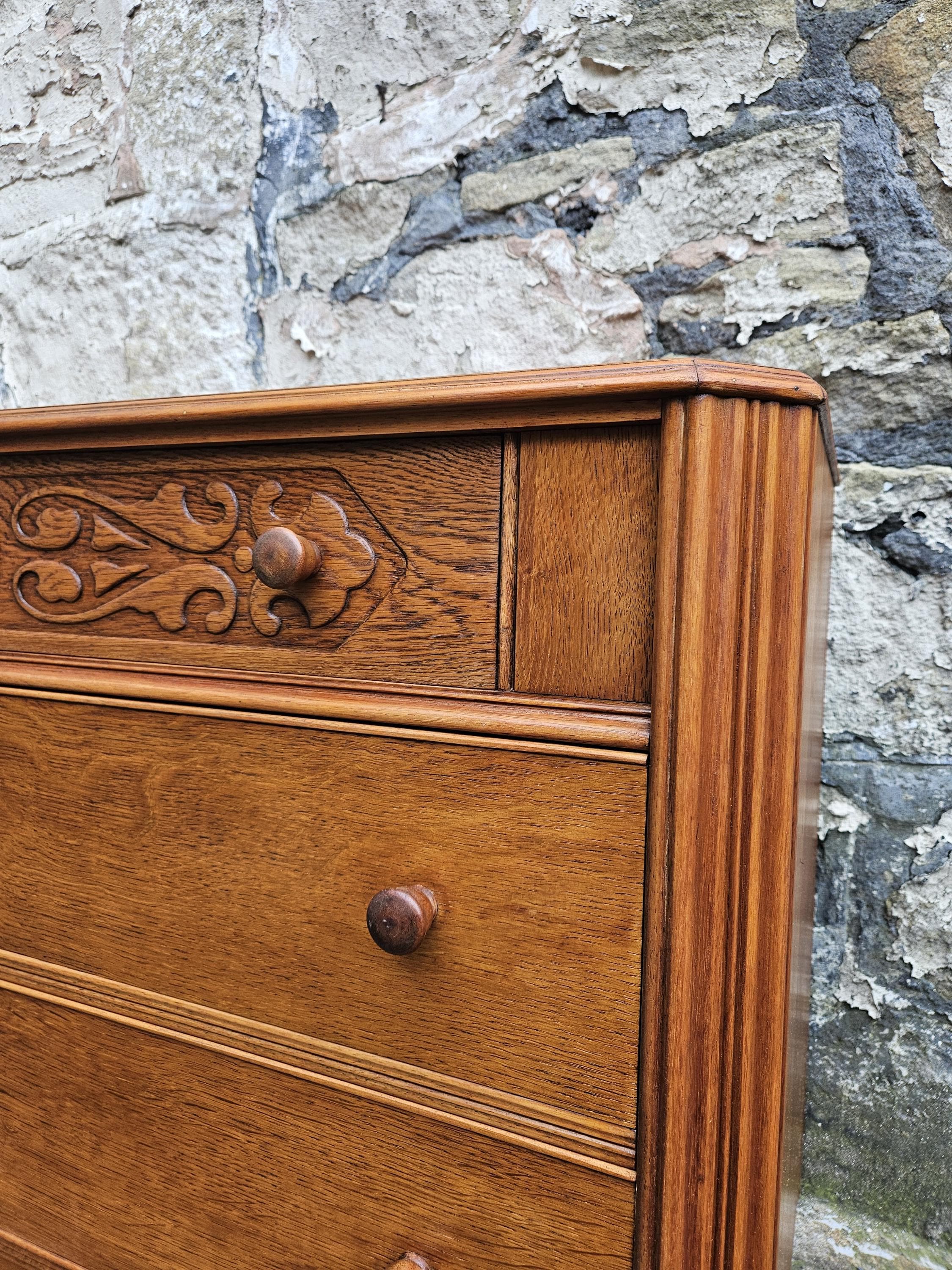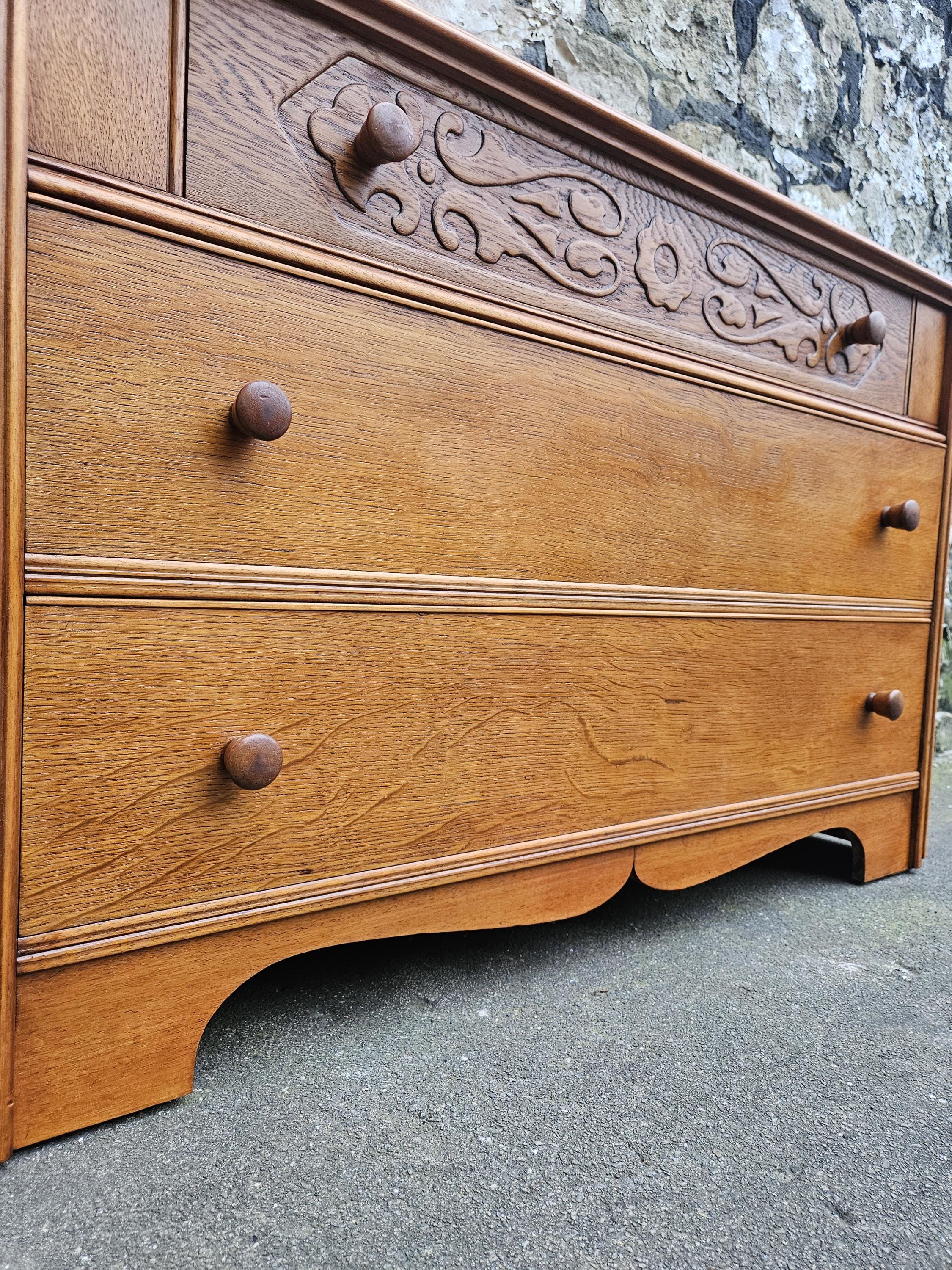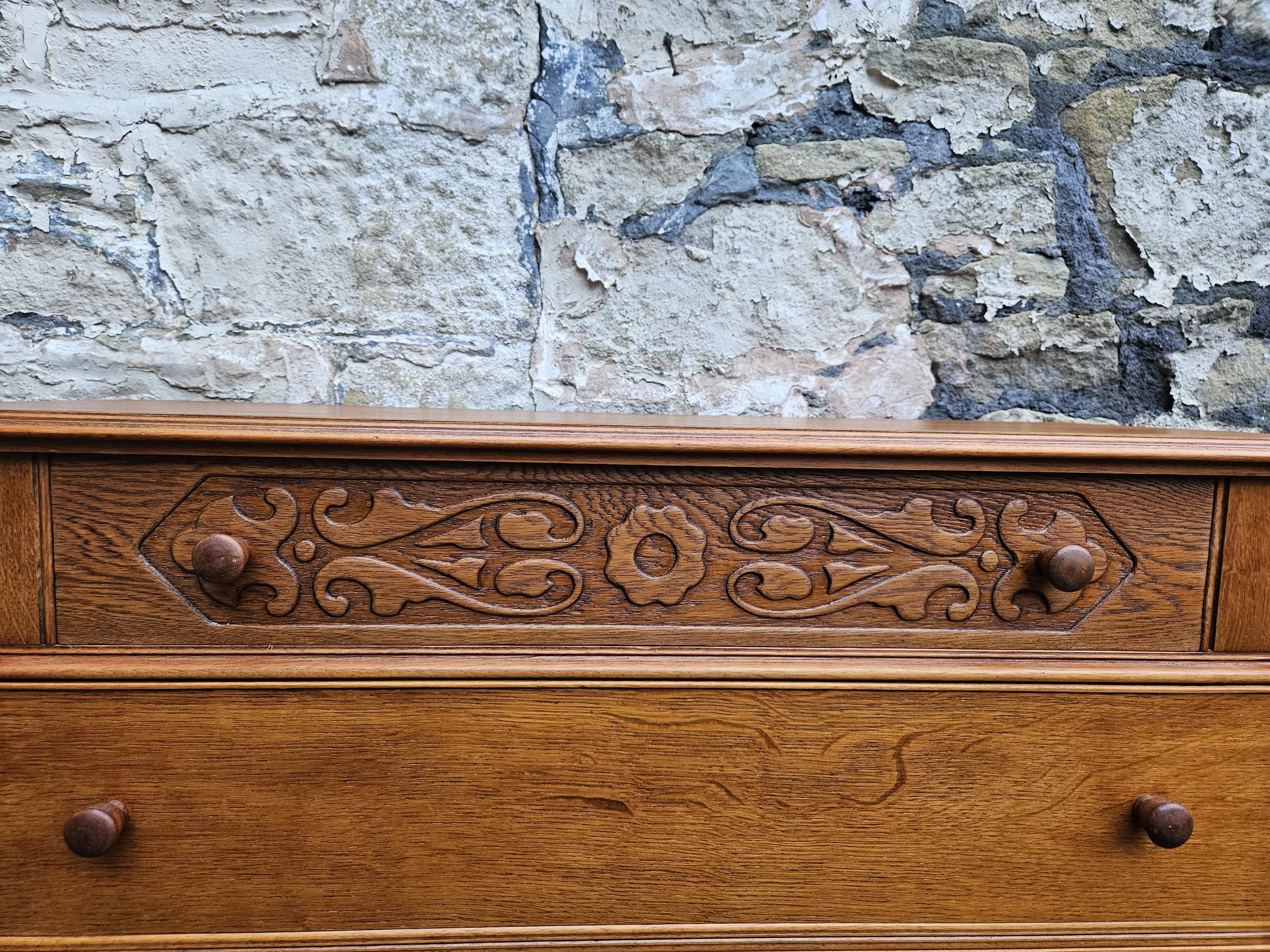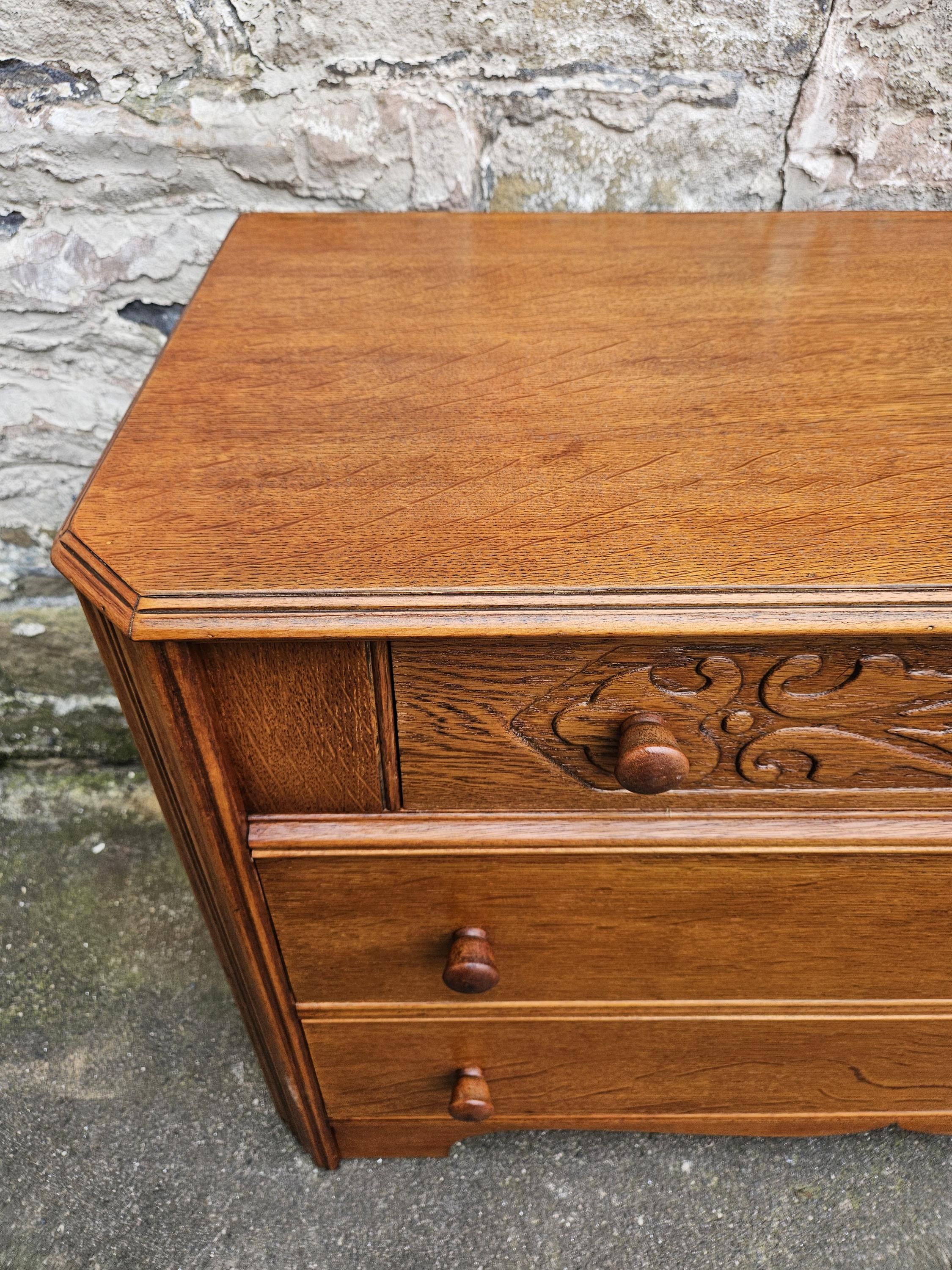 A stunning piece of vintage and antique furniture in a three drawer oak chest by Austinsuite furniture. The cabinet consists of three hand crafted drawers with each drawer having superb dove tail jointing and offering excellent storage. To each of the drawer fronts there are two wooden pull handles. The cabinet has superb carved detailing running through out the chest with a beautiful carved decoration within the top drawer in a floral design angled sides with a column design within the centre and a oak scalloped edge running along the bottom. The chest has been hand crafted by Austinsuite and is a wonderful piece of vintage and antique furniture with great proportions, a beautiful oak colour and a superb look and design that would suit any home or environment.